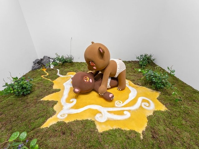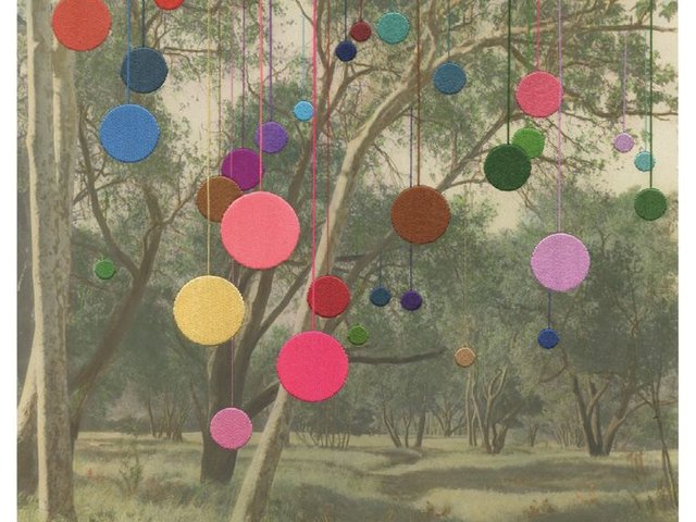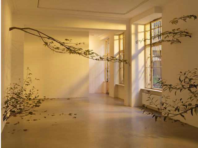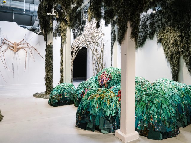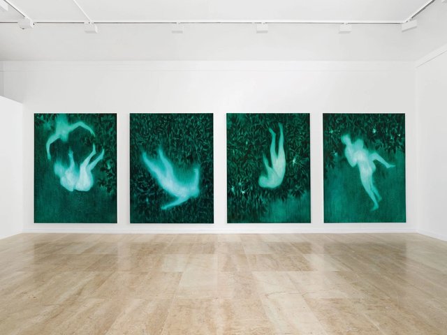 L'artiste explore le thème de la chute dans une installation toute de vert vêtue.
