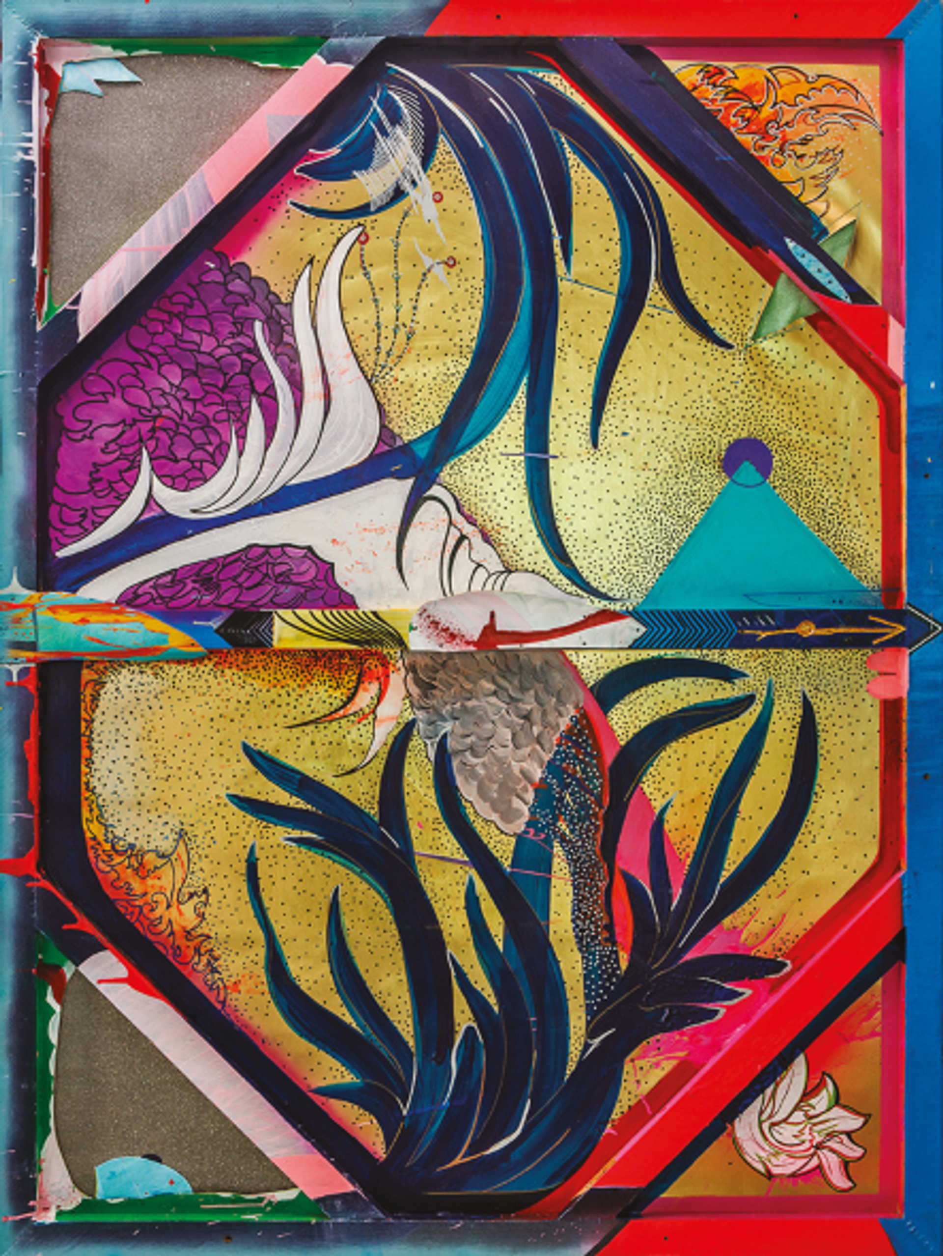 Mimi Amini, Hidden Landscape, 2020, technique mixte (peinture, feuille d’or, collage, couture et découpes de tissu industriel et de laine). © Etemad Gallery