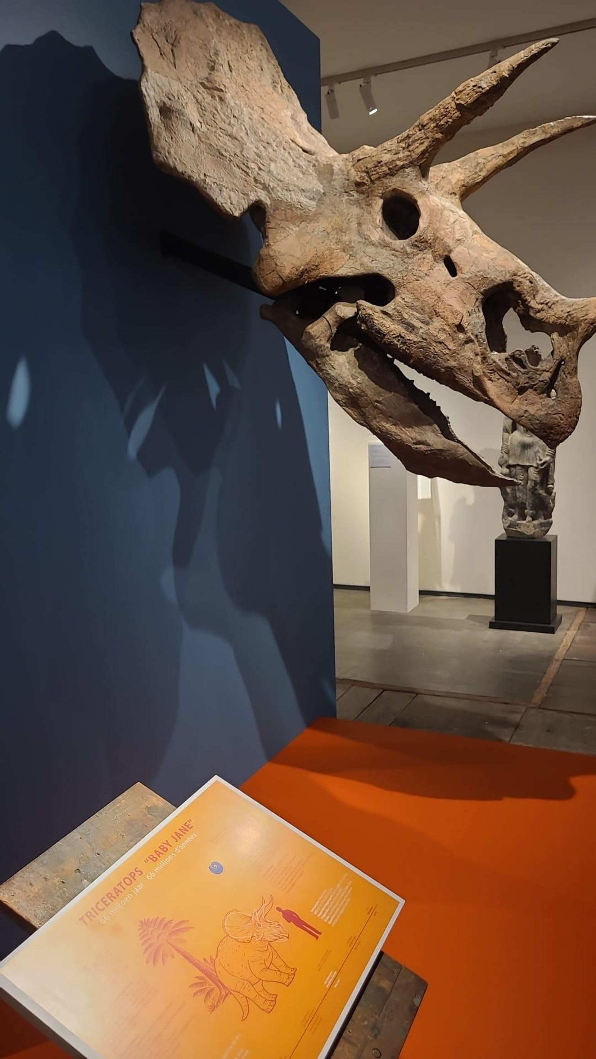 La galerie Grusenmeyer & Woliner expose dans une allée de la BRAFA le crâne d’une bestiole plutôt impressionnante, quoique herbivore : un Triceratops surnommé « baby Jane », vieux de 66 millions d’années, soit de la fin du Crétacé. Assorti d’une présentation soignée et colorée, l’animal est affiché à plus de 500 000 euros.