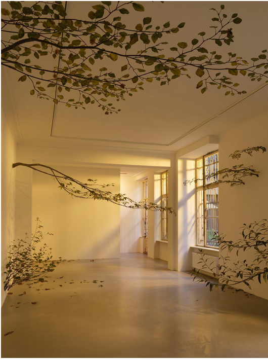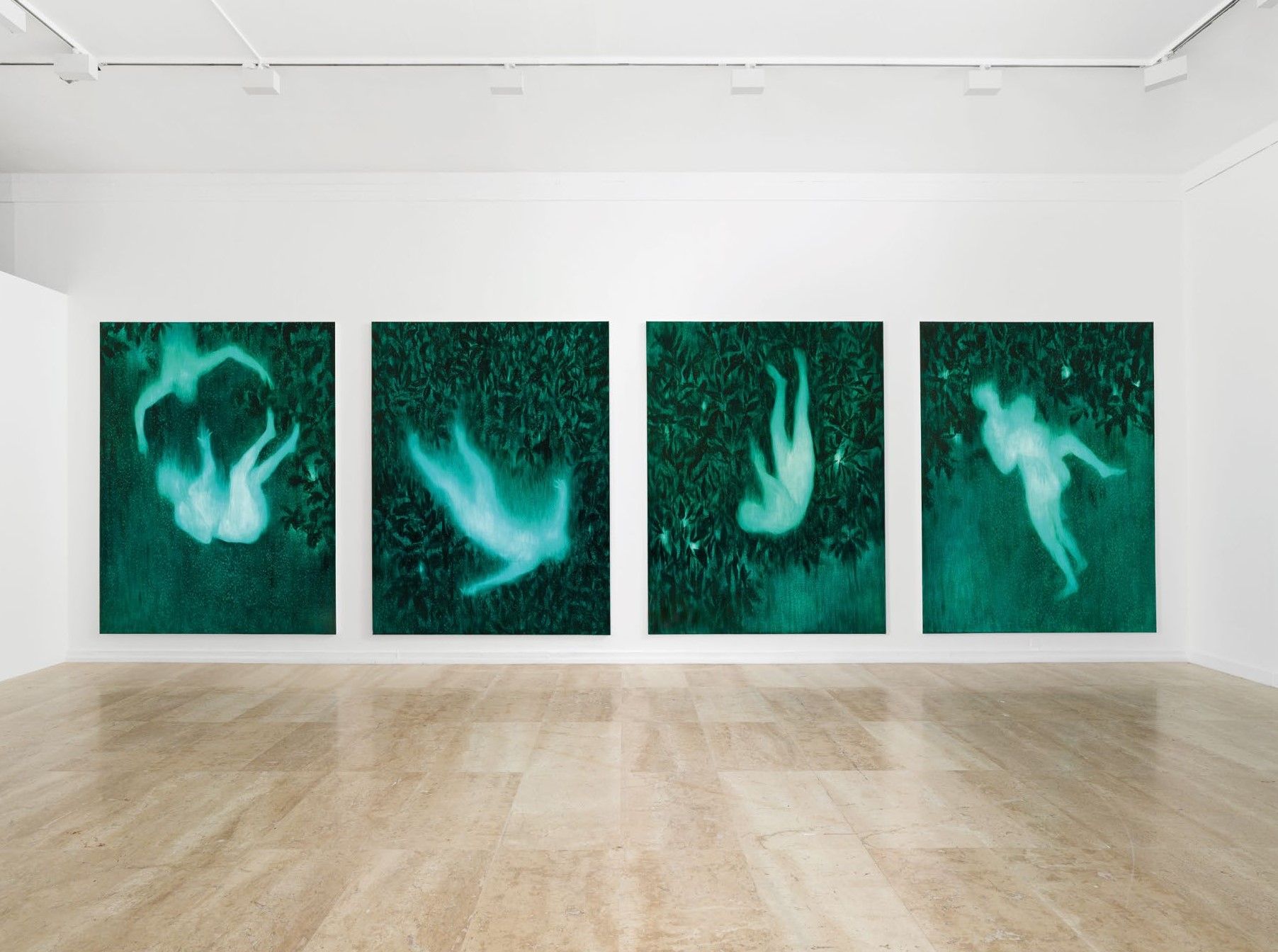 L'artiste explore le thème de la chute dans une installation toute de vert vêtue.