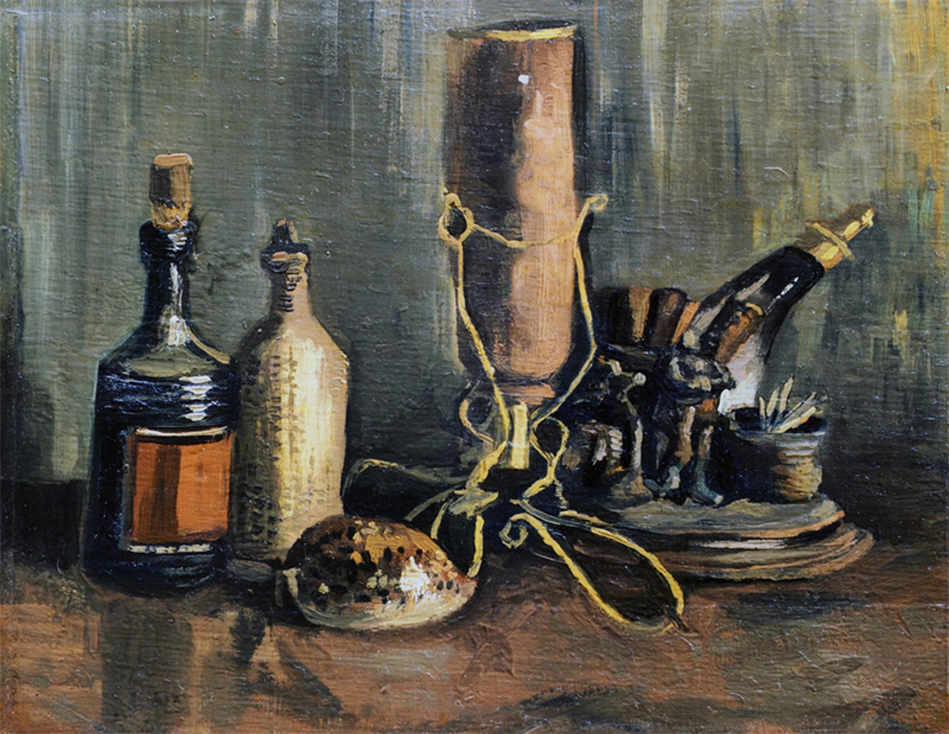 Vincent van Gogh, Nature morte aux bouteilles et au coquillage porcelaine, novembre 1884 - avril 1885, huile sur toile sur panneau, 31,8 x 41,3 cm. Courtesy Noordbrabants Museum