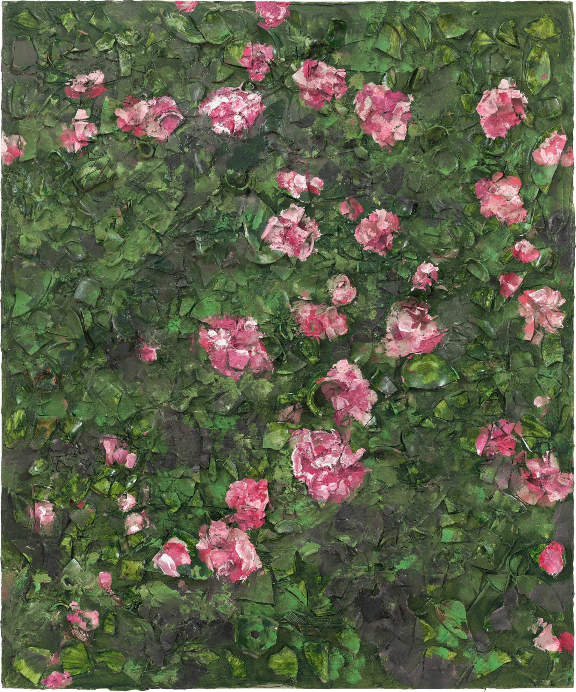 Julian Schnabel, Rose Painting (Near Van Gogh’s Grave) XVII, 2017, huile, plats, et bondo sur bois, 182,9 x 152,4 x 18 cm. Photo : Tom Powel Imaging. © Julian Schnabel Studio © Adagp, Paris 2018