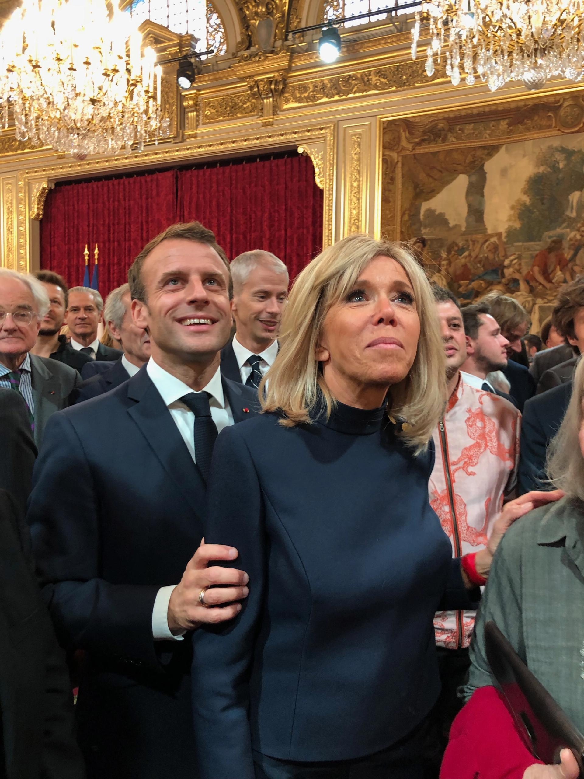 Emmanuel et Brigitte Macron devant Franck Riester, nouveau ministre de la Culture, au Palais de l'Élysée vendredi 19 octobre. Photo : Philippe Régnier