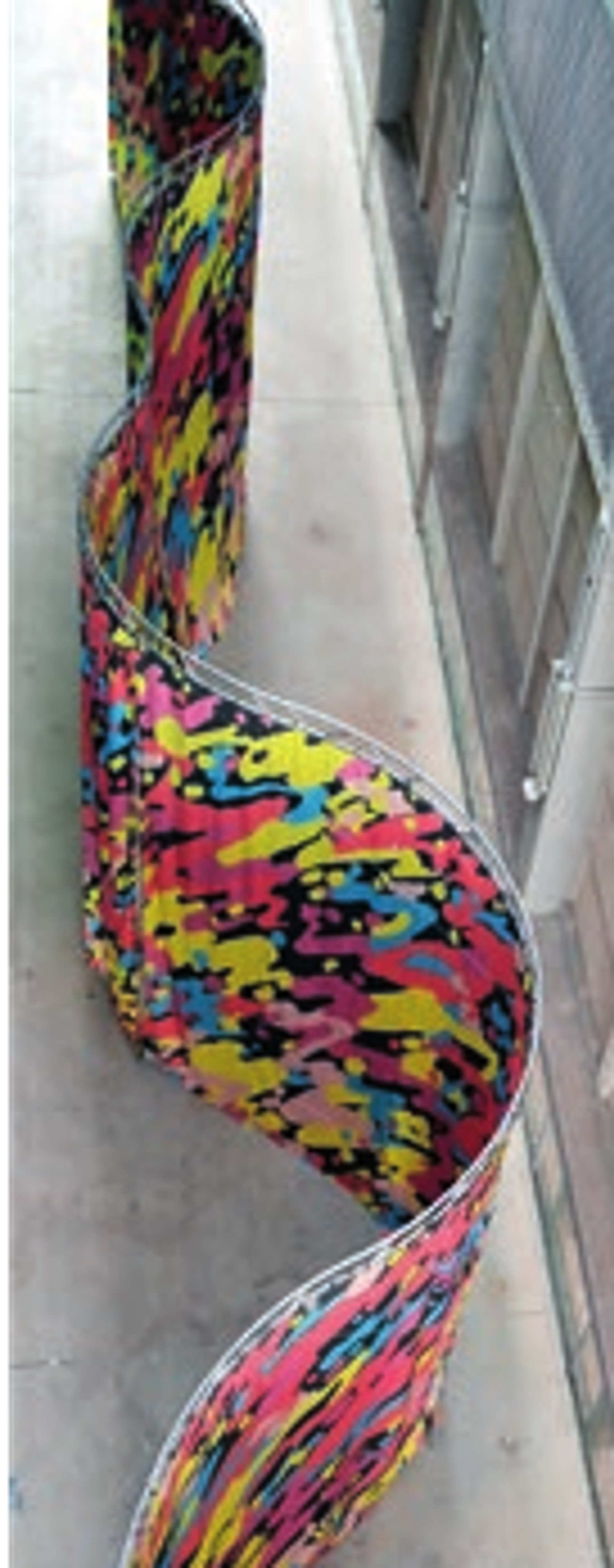 Les différentes manifestations et conséquences du gigantisme artistique depuis les années 1950 y sont développées. Dans l’énorme hangar sont installées des œuvres de taille inhumaine pour un collectionneur normalement constitué. Delphine Reist fait rouler un pont lumineux sur des rails (scanner démesuré) balayant le sol de l’exposition depuis le plafond; Cathédrale de Carlos Bunga qui, sans le cartel, est une indécelable structure en carton appuyée contre un mur, mimant des contreforts (en car-ton!) hyperréalistes; Effondrement d’arcs, un Mikado courbé géant de Bernar Venet qui impose toujours sa matière et sa présence «à l’estomac» – et qui maîtrise parfaitement art et industrie dans tous les compartiments de la production à grande échelle; un paysage industriel de Liam Gillick A Short Text on the Possibility of Creating an Economy of Equivalence (2005) : des plaques de tôle découpées selon des courbes de rendement ou de progression financière qui, posées l’une devant l’autre, forment un paysage montagneux. Un discours bâti sur une utopie productiviste, vaguement fouriériste, trahit, comme pour les autres œuvres de cet espace, la relation ambiguë entre art et industrie – du moins sur le terrain de la valeur du travail et de la redistribution des richesses. Il n’est pas dit si le produit de la vente de la pièce de Gillick fut partagé avec des ouvriers dont il semble être un ardent défenseur. À l’étage 1, Shirley Jaffe déroule ses formes-motifs néomatissiennes en face d’un Claude Viallat qui laisse pendre une bâche décorée d’empreintes logotypiques, alors que Toroni répète sur toile à l’infini. On est en plein formatage rationaliste industriel délirant.
