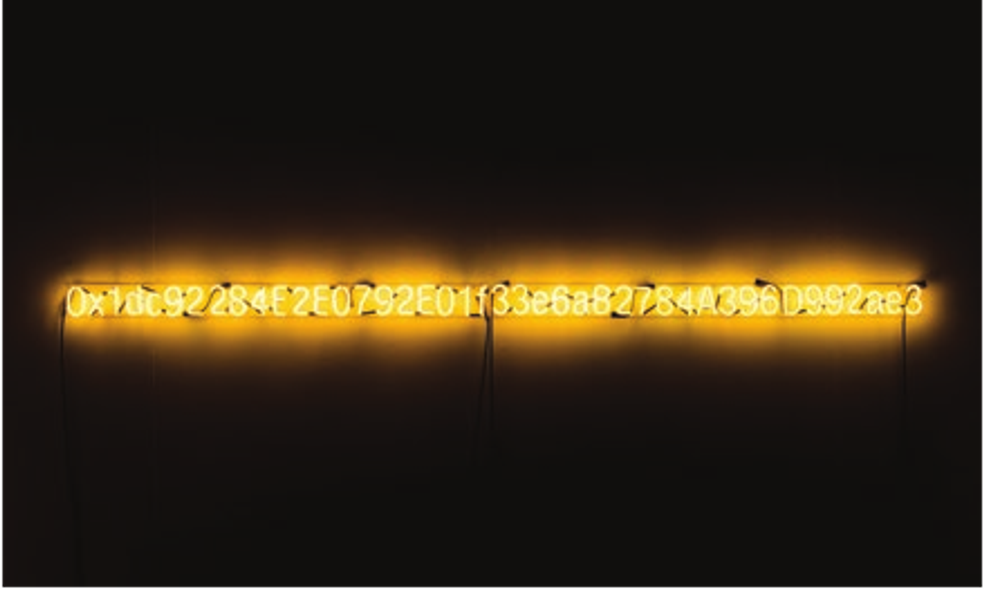 Kevin Abosch, Yellow Lambo (2018), reproduisant l’adresse de la blockchain d’une Lamborghini. Courtesy de l’artiste
