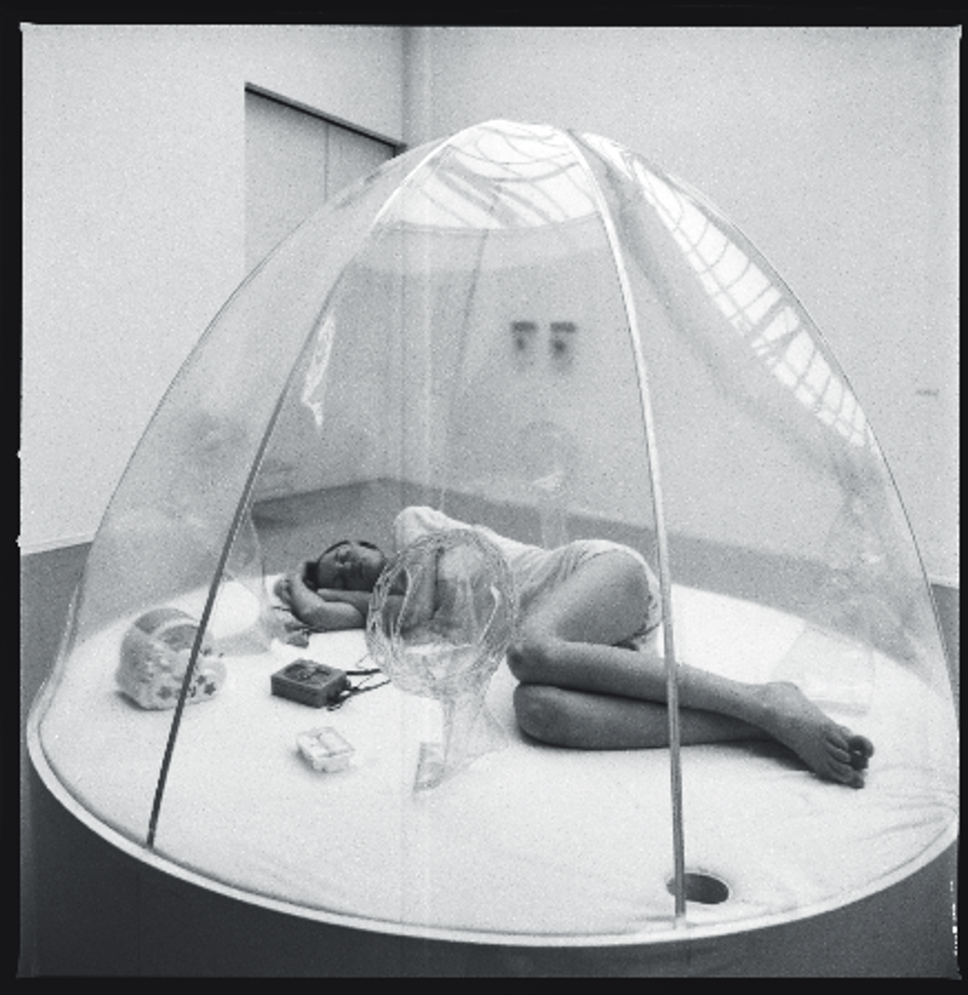 Performance de Vidya Gastaldon, lors de l’exposition «L’Hiver de l’amour» au musée d’Art moderne de la Ville de Paris, 1994. © Philippe Munda