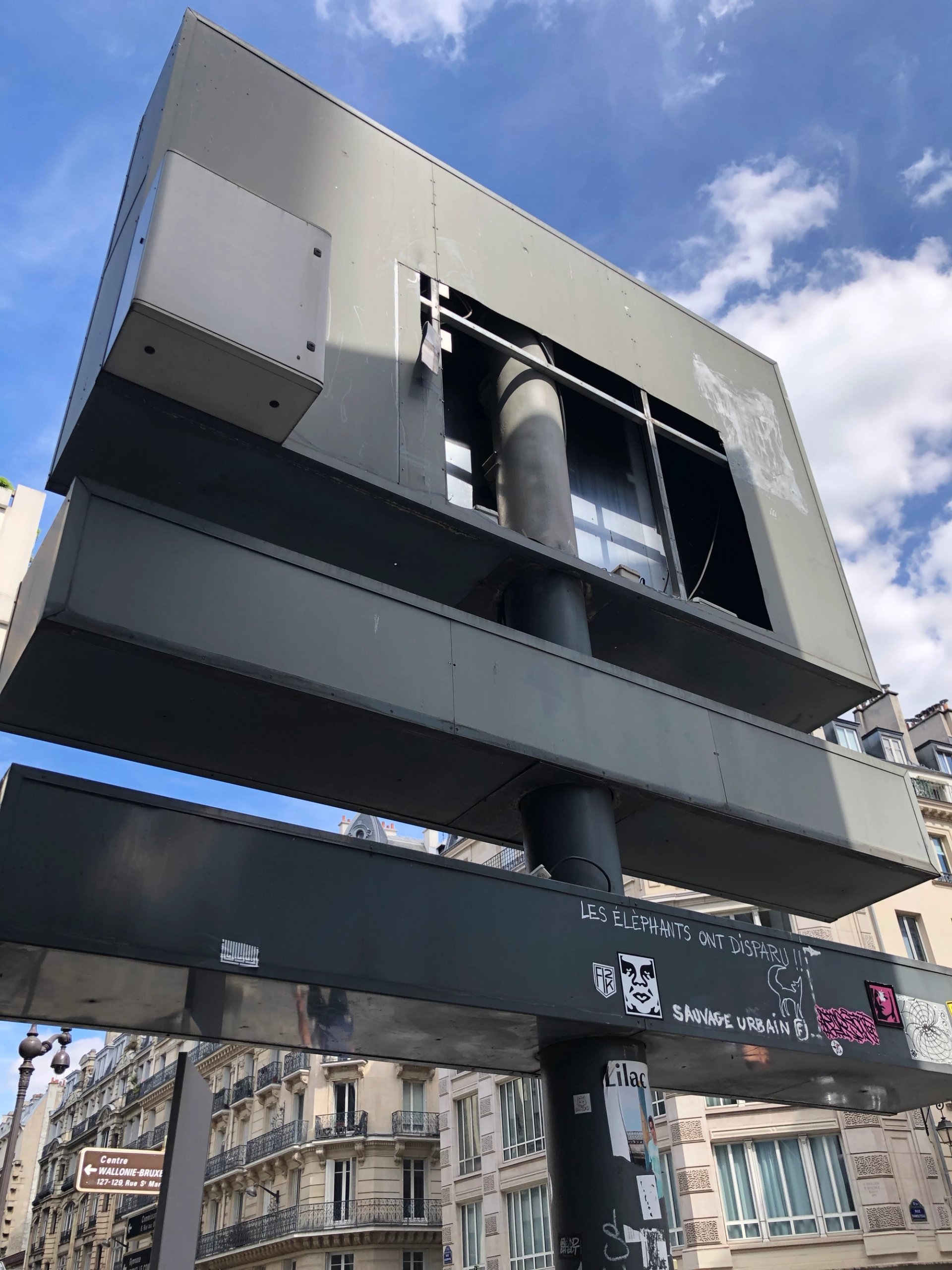 Panneau découpé où se trouvait l'œuvre de Banksy Fifty years since the uprising in Paris 1968. The birthplace of modern stencil art. Photo : Philippe Régnier