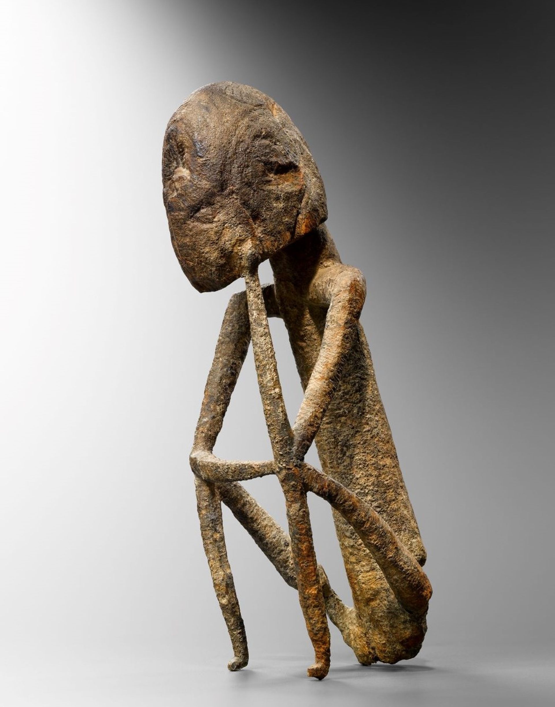 Le sculpteur Jan Calmeyn n’a jamais caché son admiration pour l’art africain, qu’il collectionne avec ferveur depuis de nombreuses années. La galerie Bernard Dulon a eu ainsi l’heureuse idée de confronter les œuvres tout en déséquilibre et en finesse du plasticien belge avec les plus belles pièces de sa collection. De ce dialogue poétique et formel émerge, fragile et terriblement humaine, une effigie Dogon dont les membres frêles et la posture crispée évoquent étrangement la statuaire empreinte de tragique de Germaine Richier. Selon Bernard Dulon, la sculpture était « censée assister le guérisseur et servir d’intermédiaire entre le patient et le monde surnaturel ».