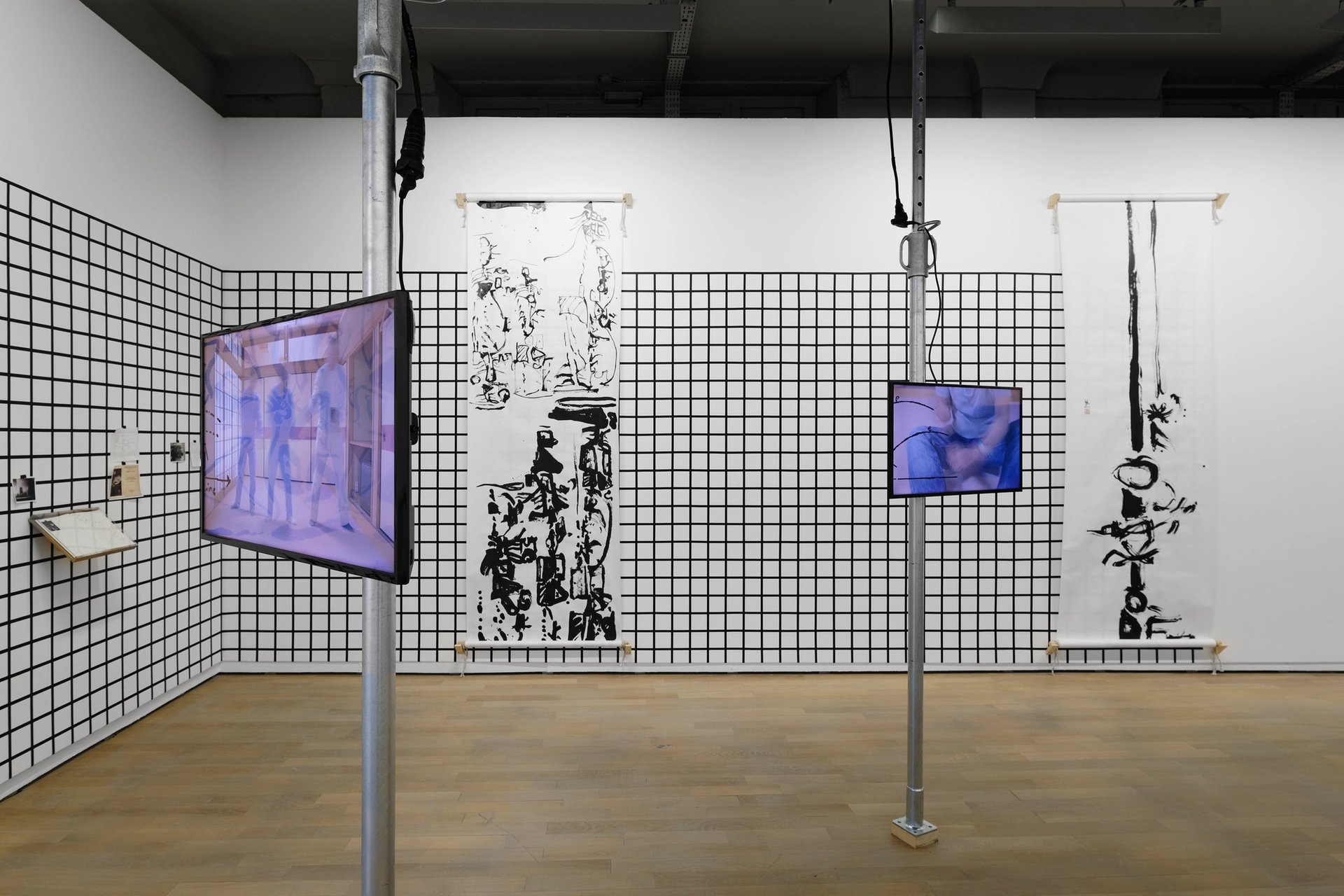 Marcos Ávila Forero, Théorie du vol des oies sauvages, notes sur les mouvements ouvriers, 2019, installation, calligraphies, vidéos et cahier. Vue de l’exposition « Le Fil d’alerte », Fondation d’entreprise Ricard, 2019. Photo : Aurélien Mole / Fondation d’entreprise Ricard