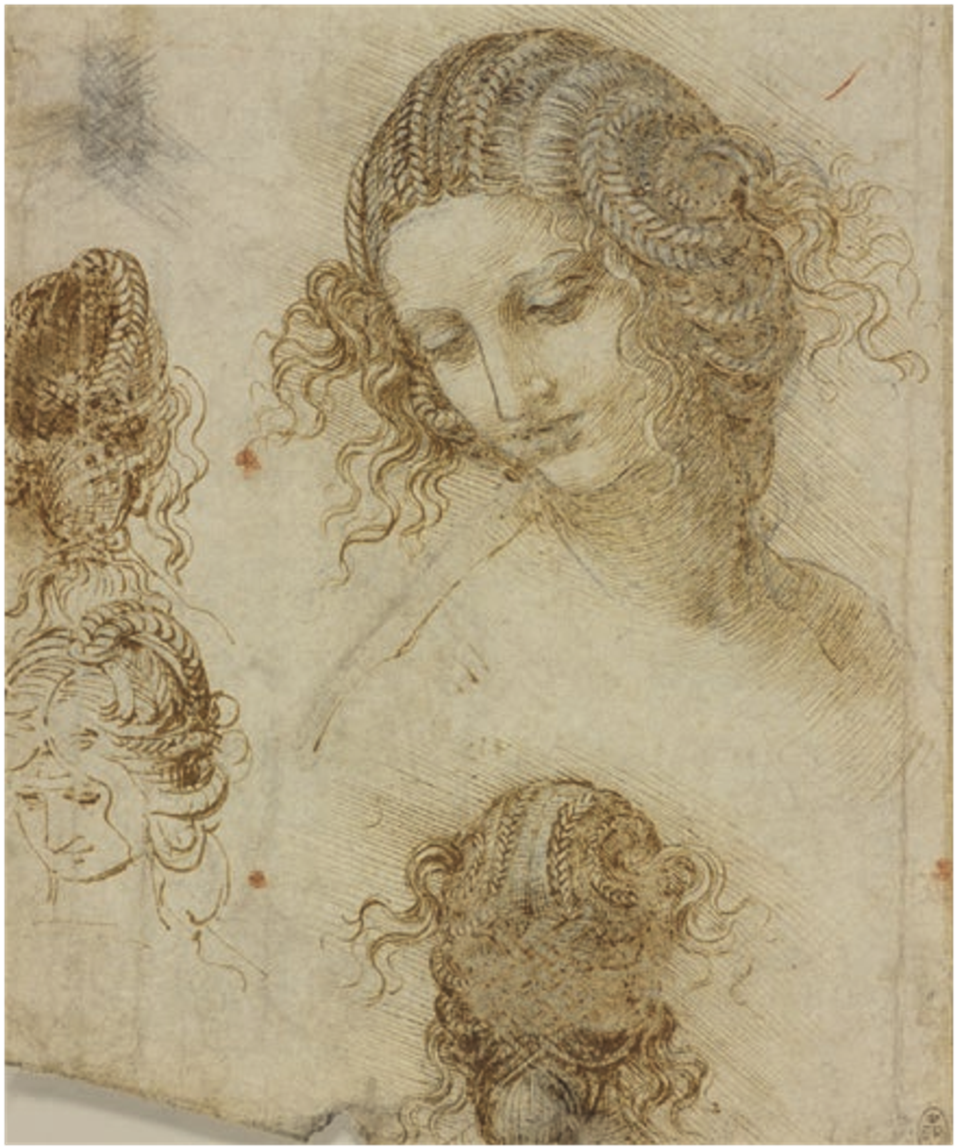 Léonard de Vinci, Études pour la tête de Léda, vers 1505-1506, pierre noire, plume et encre brune, Windsor Castle, The Royal Collection, Royal Library, Royal Collection Trust. © Her Majesty Queen Elizabeth II, 2019