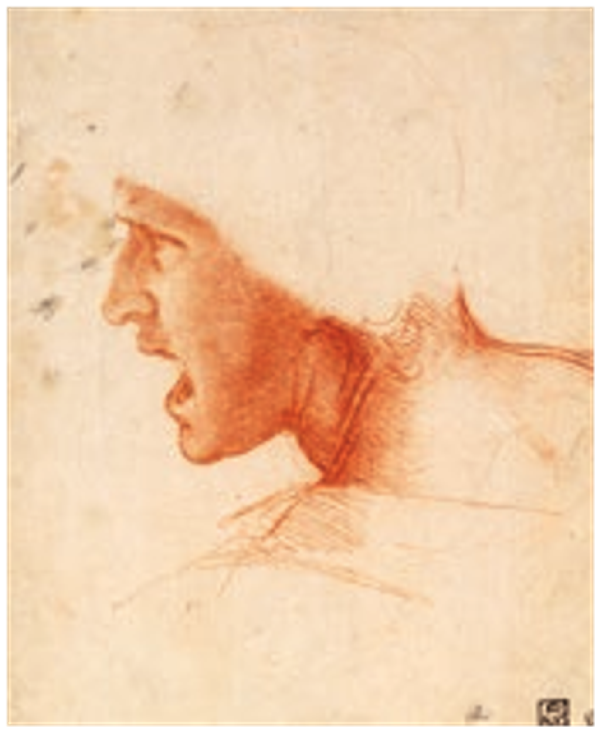 Léonard de Vinci, Étude de figure pour La Bataille d’Anghiari, vers 1504, sanguine sur papier préparé ocre rose, Szépmuvészeti Múzeum, Budapest. © Szépmuvészeti Múzeum – Museum of Fine Arts Budapest, 2019