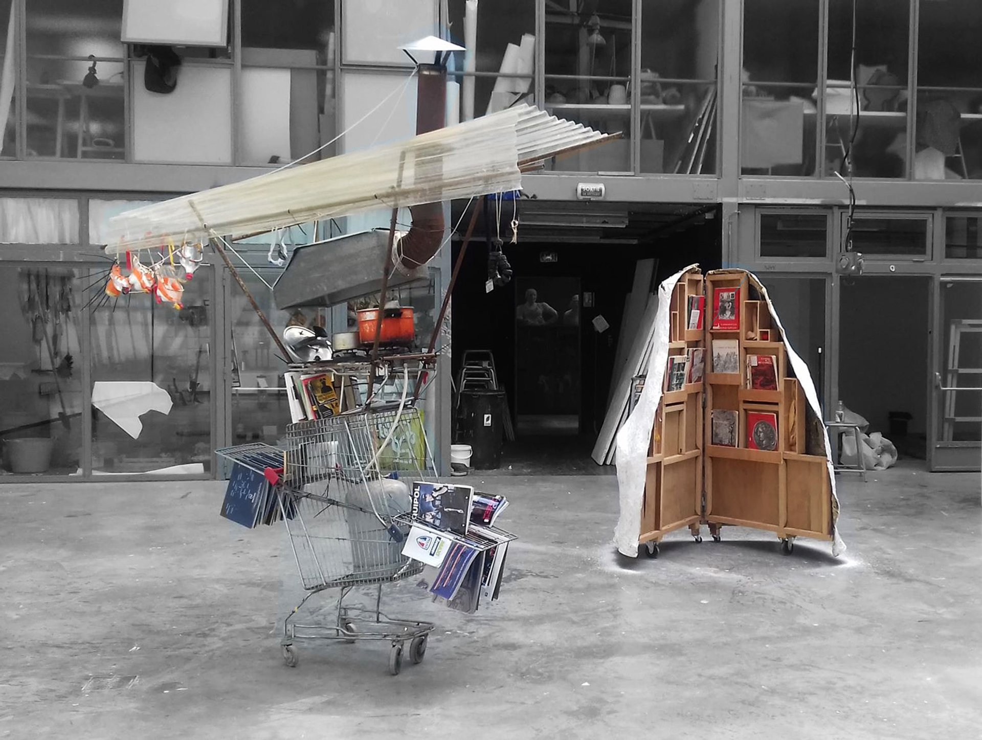 Julien Salban-Créma, “La bibliothèque des NéoFac-Similés (BNF)”, 2019, Collection de documents pédagogiques sur l’histoire et la géographie des civilisations à travers des facs-similés, livre L'âge de l'ersatz de William Morris, matériaux divers, 200 x 120 x 130 cm. © École supérieure d’art Clermont Métropole