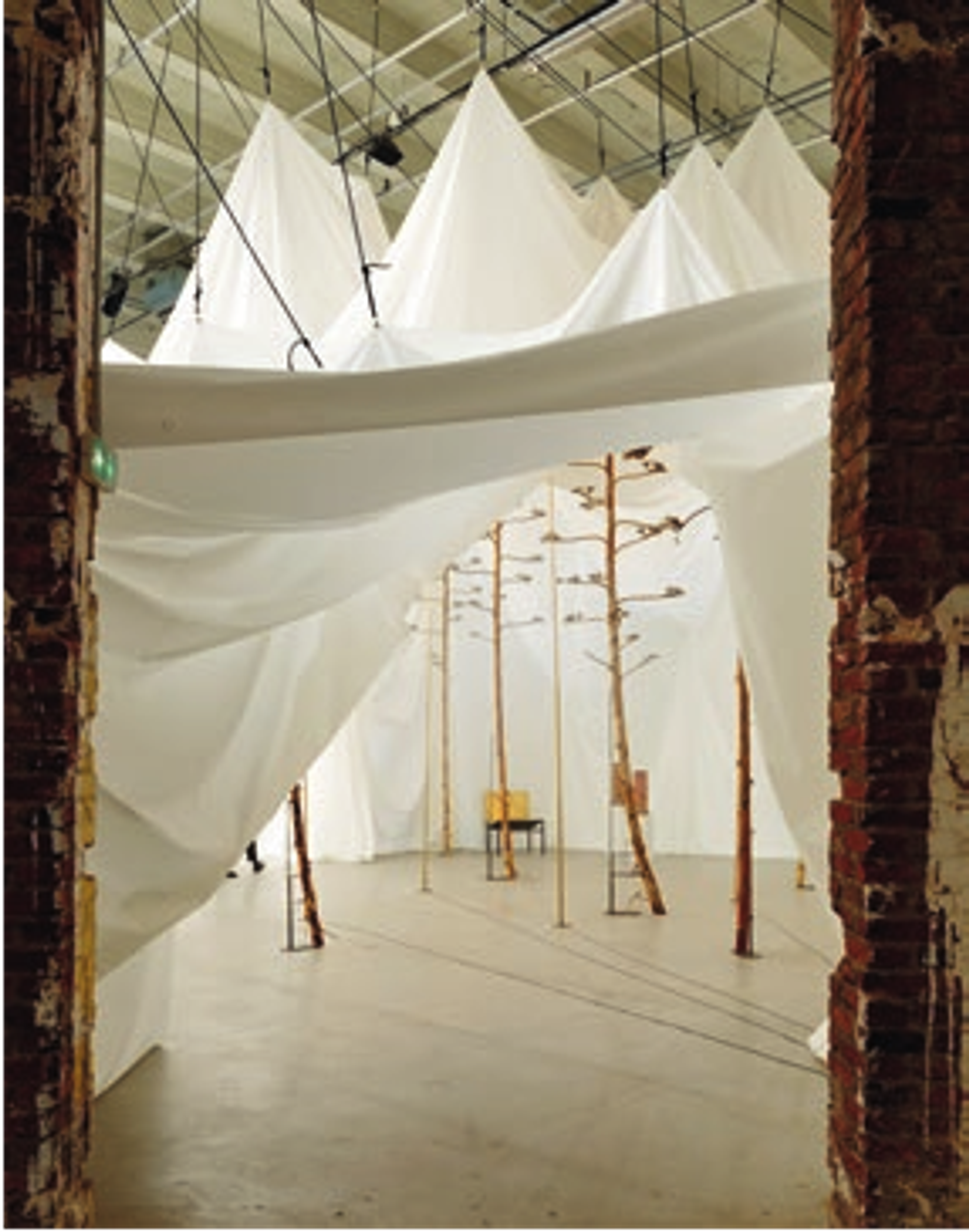 Martin Belou, Demain les chiens, 2019, tente, aimants, fleurs d’agave, lampes, mitres de cheminées, bancs, tissus, drisse, bois, laiton, terre cuite, acier. Courtesy de l’artiste. Photo Aurélien Mole, D.R.