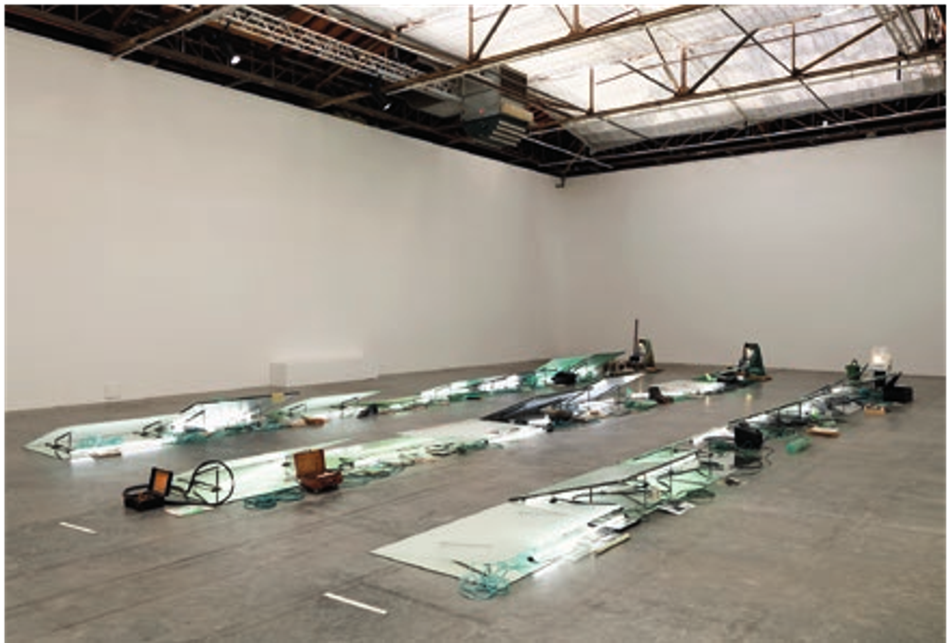 Laura Lamiel, J’ai vu les buffles d’eau, 2019, verres trempés, peintures fixées sous verre, cadres en métal, tubes fluorescents, livres, impressions sur acier émaillé, cactus et mousse végétale, valises, objets de la collection de l’artiste. Courtesy de l’artiste & Marcelle Alix (Paris). Photo Aurélien Mole