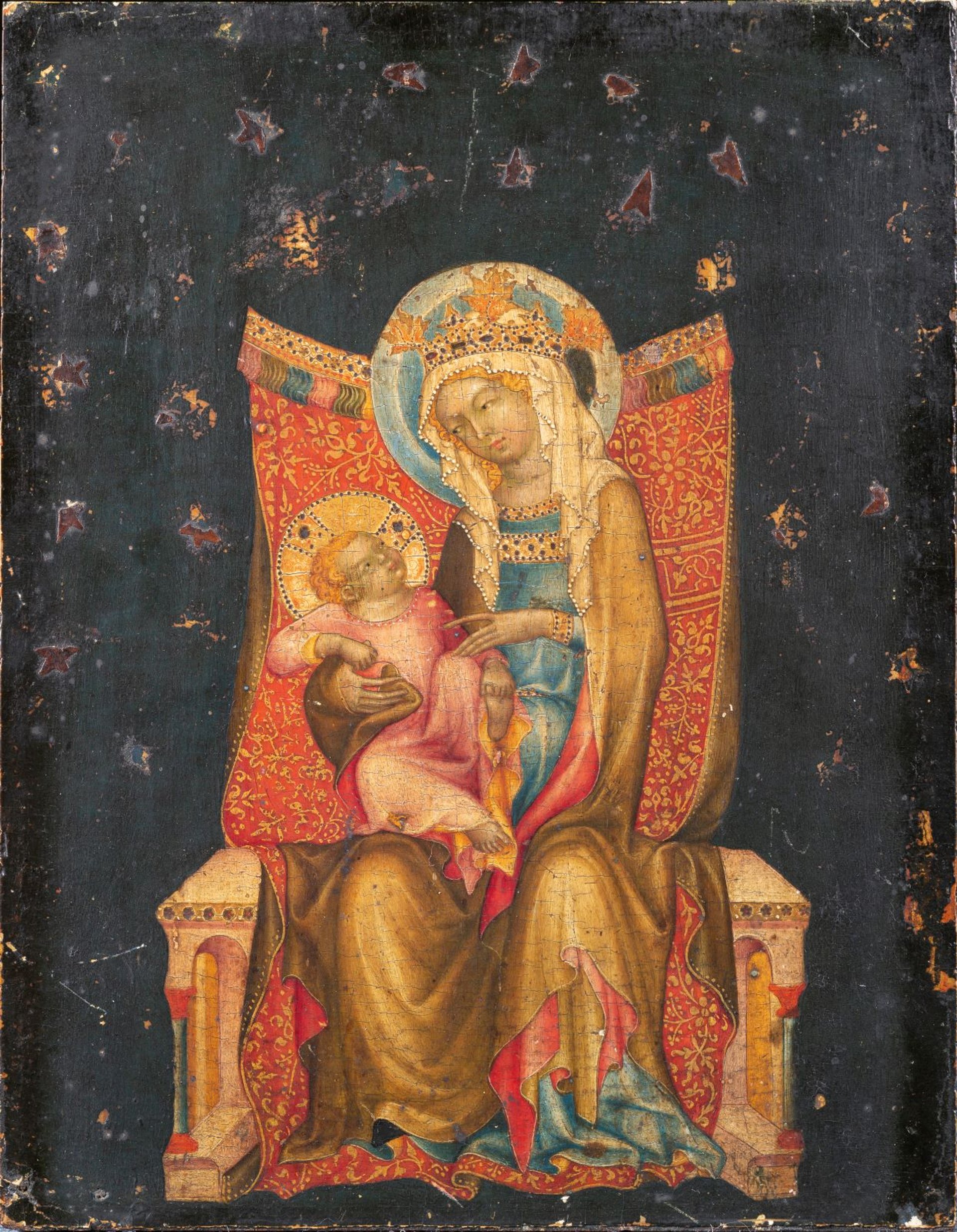 Maître de Vyšší Brod (Bohème, vers 1350), La Vierge et l’enfant en trône, tempera sur panneau, 22 x 20 cm, New York, The Metropolitan Museum of Art. © Cortot & Associés