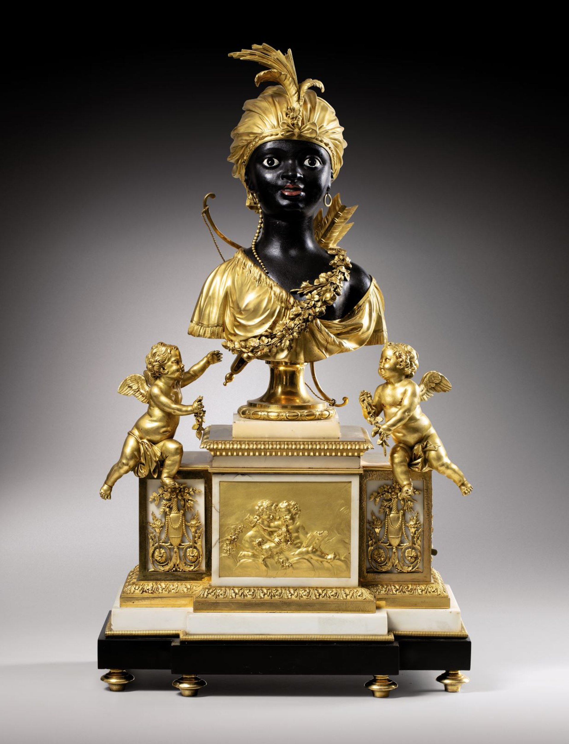 D’époque Louis XVI, cette pendule fut présentée à la reine Marie-Antoinette pour les étrennes en 1792 au palais national des Tuileries avant d’intégrer le garde-meuble royal. Les yeux du personnage noir donnaient l’heure, tandis que la pièce émettait des airs de musique. L’horlogerie en est due à Jean-Baptiste-André Furet et François-Louis Godon, et les bronzes de la base sont attribués à Étienne Martincourt.