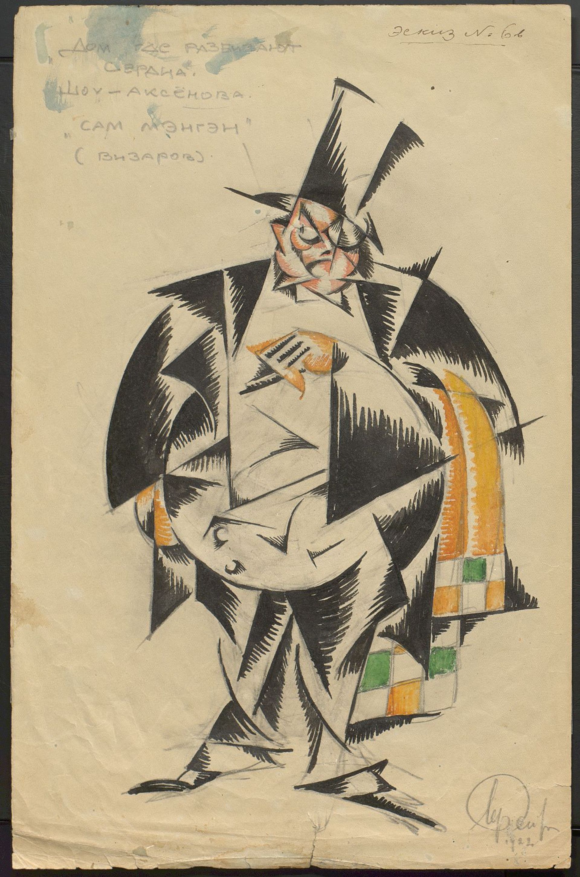 Eisenstein, Esquisse pour La maison des cœurs brisés de Shaw, costume du Personnage de Sam Magan, 1922, paper, graphite pencil, watercolor, 35,2 x 22,8 cm. © Russian State Archive of Literature and Art