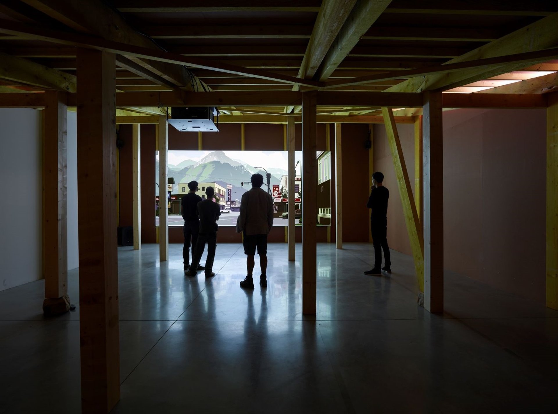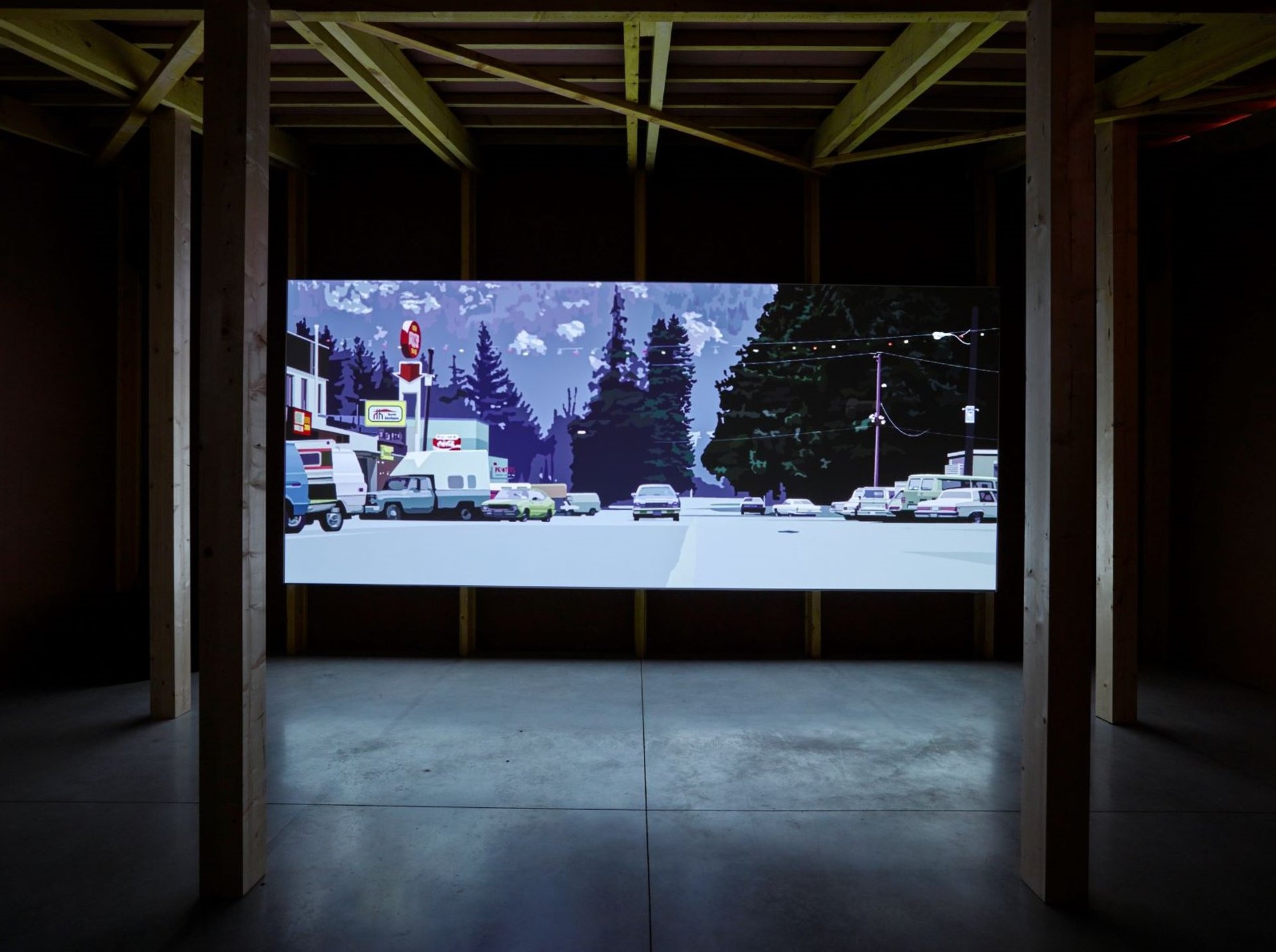 Visible en permanence depuis la rue, l’endroit a des atours de lanterne magique qui ont rendu indispensable la conception d’un dispositif de monstration. Impressionnante d’ingéniosité, l’installation in situ créée dans ce but dialogue avec l’architecture tout en faisant œuvre. Scindée en deux dans le sens de sa hauteur, la nef accueille une sorte de charpente au sein de laquelle on pénètre pour se retrouver face à un grand écran. Sommaire, la construction sert de salle de projection à un dessin animé contemplatif, dont le projet tient du déraisonnable. Depuis 2018, Alain Bublex a en effet entrepris de reproduire plan par plan First Blood, le premier opus de la saga des Rambo, réalisé par le Canadien Ted Kotcheff en 1982. Et s’il en est seulement aux 18 premières minutes d’un film qui en compte 90, l’artiste ressent désormais « la nécessité d’aller jusqu’au bout » de son appropriation. Exempte de nostalgie, l’attention de l’artiste a moins été happée par l’action musclée que par le décor, une petite ville américaine nichée dans les contreforts des Rocheuses, saisie au début de l’hiver. Il dit s’en être rendu compte au gré des rediffusions télévisées : c’était le paysage qui retenait exclusivement son intérêt. Il en fera l’unique personnage du film dans sa reprise au dessin vectoriel, une technique à laquelle il est fidèle depuis son premier ordinateur.