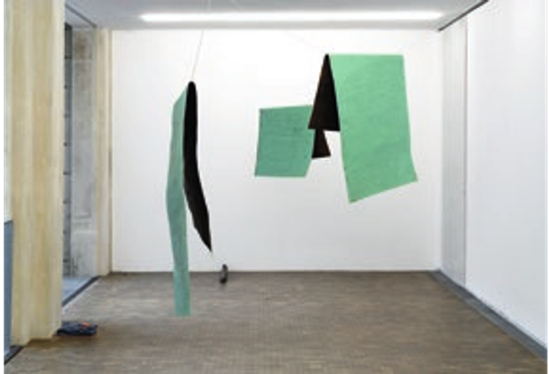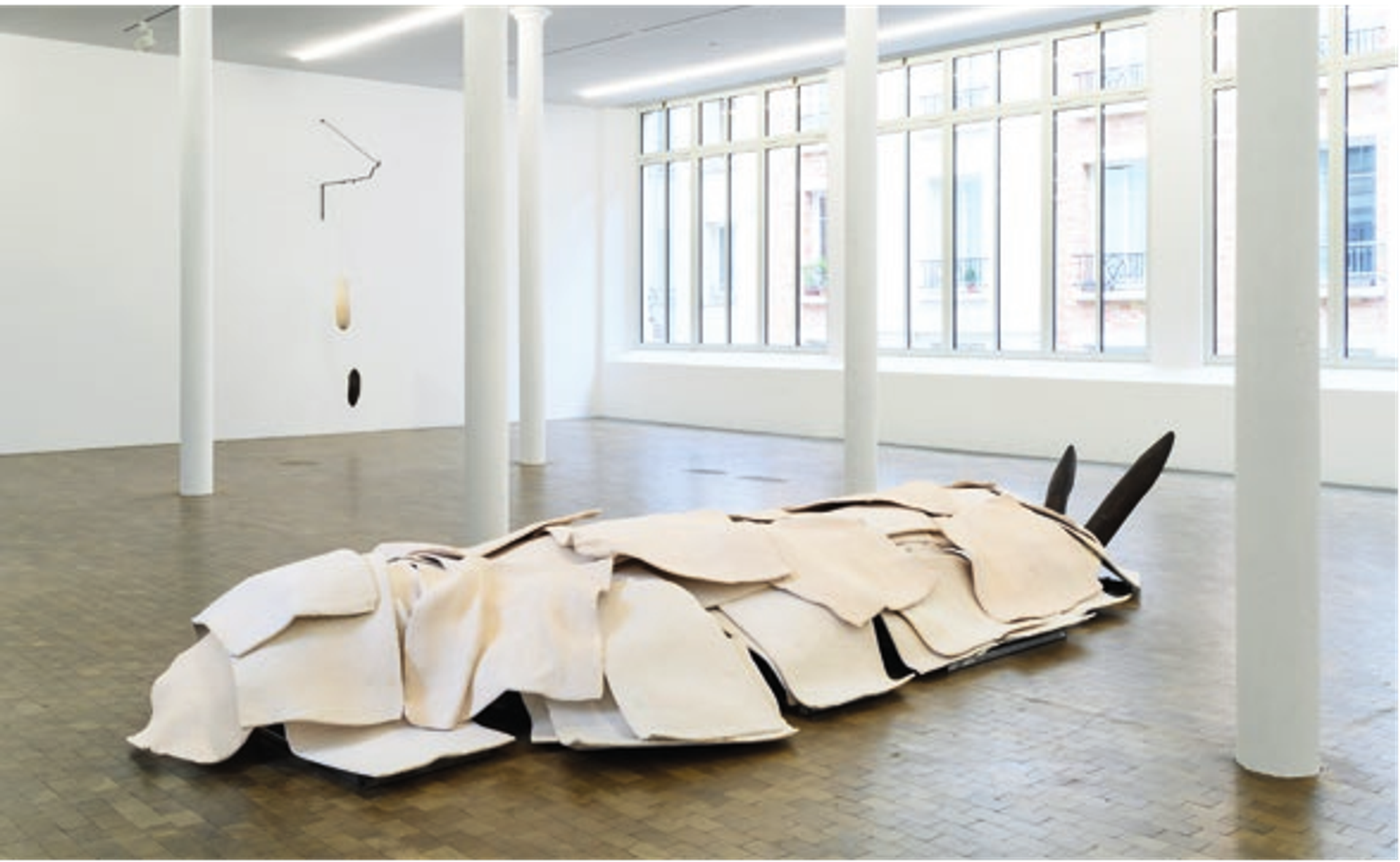 Réparés à l’époque, les points d’impact ressemblent à des pansements, ou des rustines, c’est très émouvant… La coupole comporte également des traces de déjections d’oiseaux. Cette surface peut évoquer les faits les plus banals comme les plus historiques. Pour l’exposition « Tumulte à Higienópolis », j’ai réalisé une grande sculpture recouverte de ce cuivre, Rauschen. Un peu similaire au manteau d’une chauve-souris, l’œuvre paraît être un habillage, quelque chose qui couvre, enveloppe, dont le volume abrite un espace intérieur. J’ai voulu créer une pièce que l’on ne peut pas voir entièrement, qui condamne le visiteur au fragment.