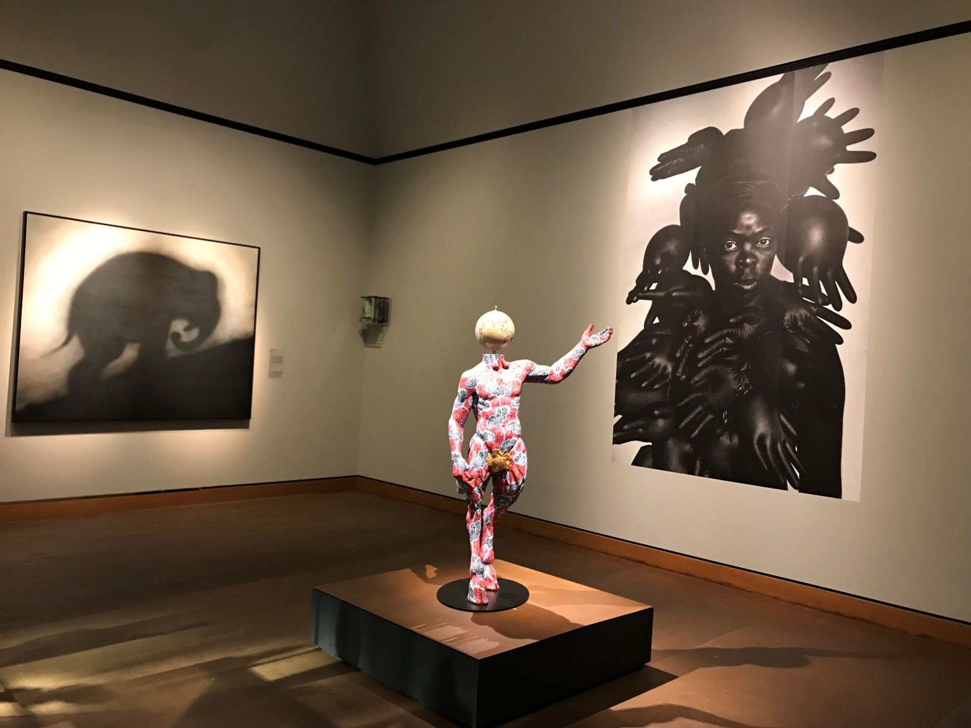 Vue de la salle Afrique avec le dieu Pan de Yinka Shonibare. Derrière, une photo d’Ed Ruscha, Sans titre, de 1986 (à gauche) et Phila I, Parktown (2019) de Zanele Muholi (à droite). Photo : B. G.-S. D.R.