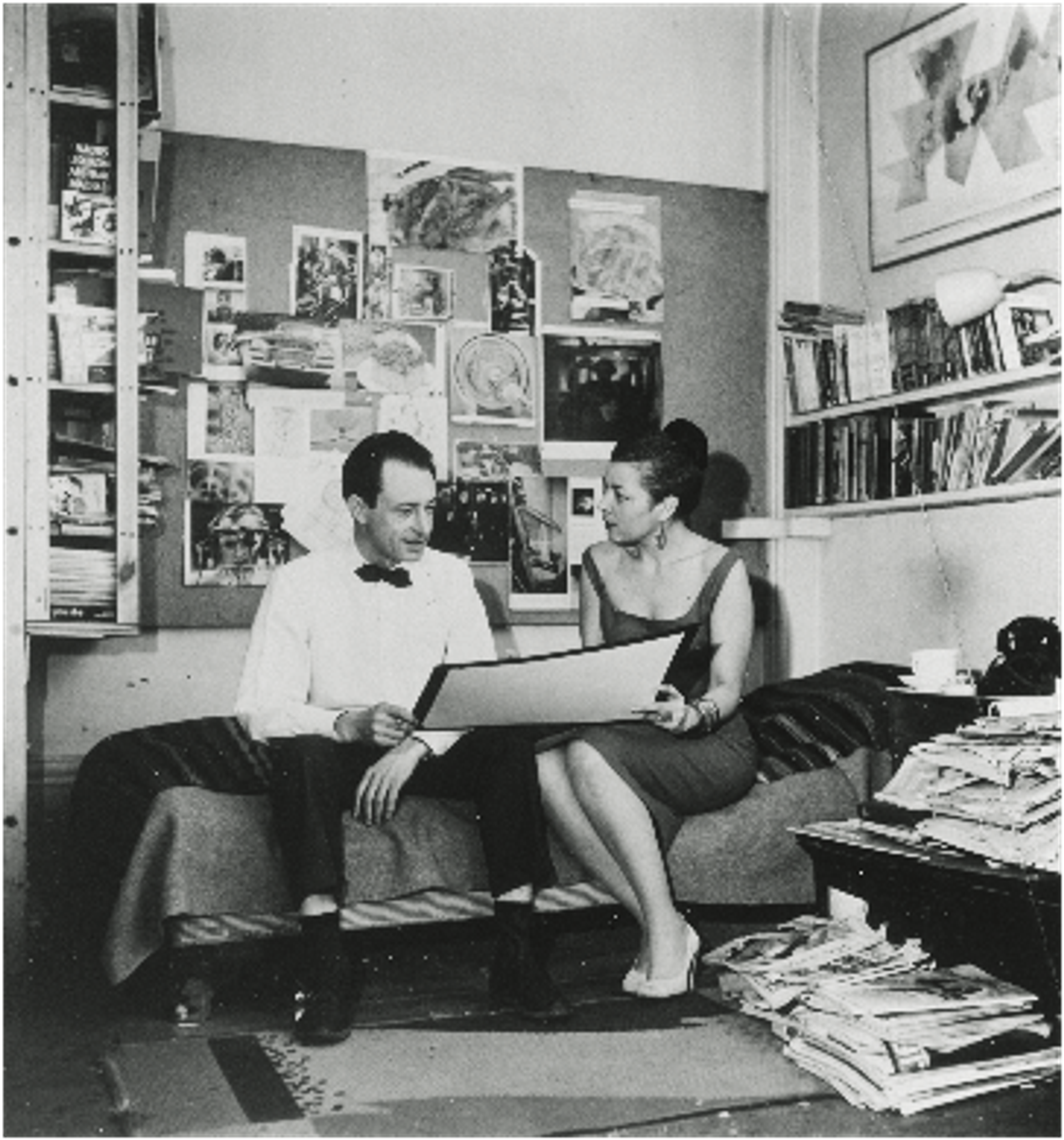 John McHale et Magda Cordell dans leur studio avec, sur un tableau d’affichage, des images aujourd’hui conservées dans la Palette #4 des archives John McHale, vers 1950-1978, épreuve gélatino-argentique, Yale Center for British Art. © D.R.