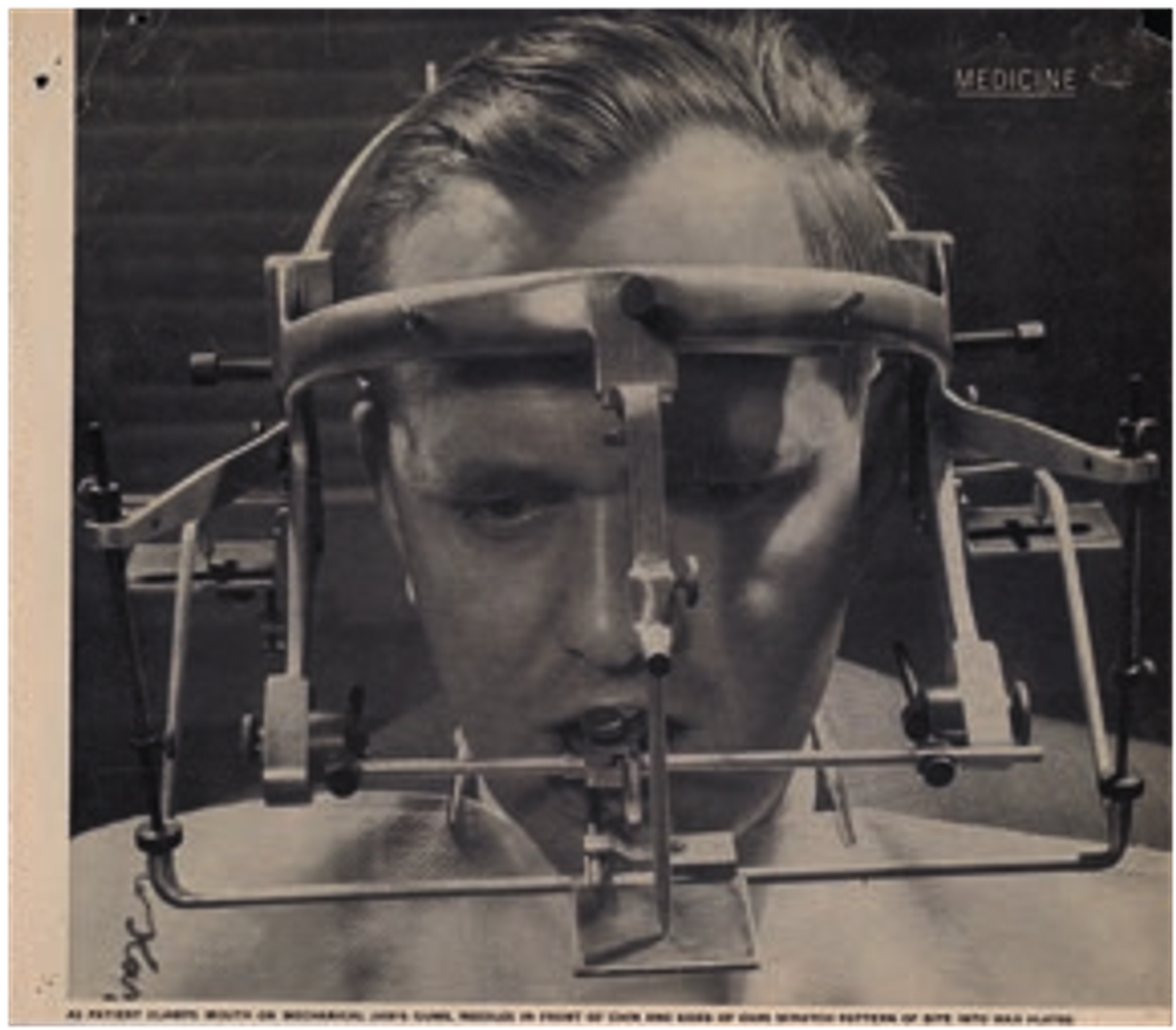 Image médicale, épinglée en bas à gauche du tableau d’affichage de John McHale, d’un patient serrant la mâchoire sur un instrument mécanique, archives McHale, Yale Center for British Art. © D.R.