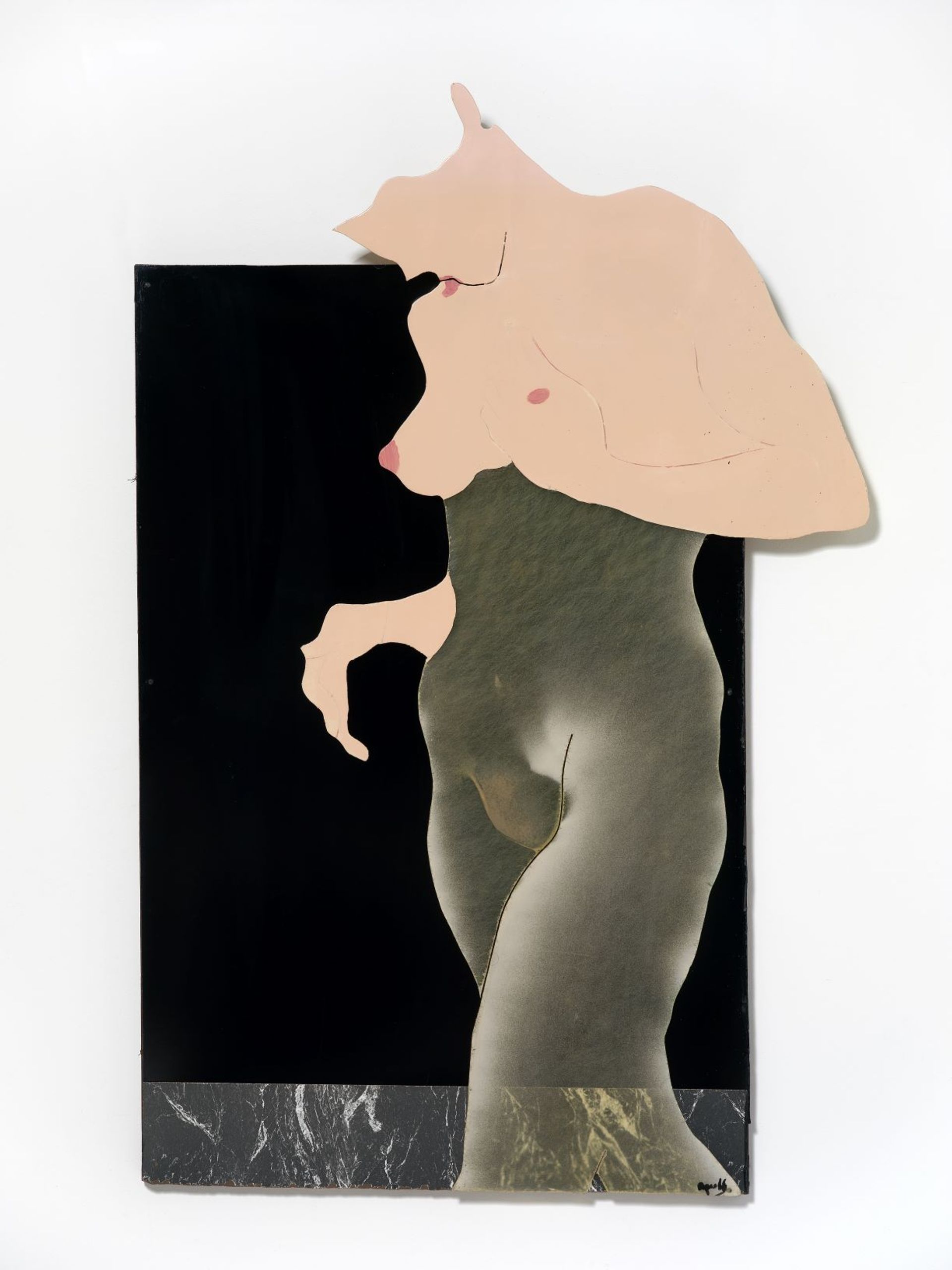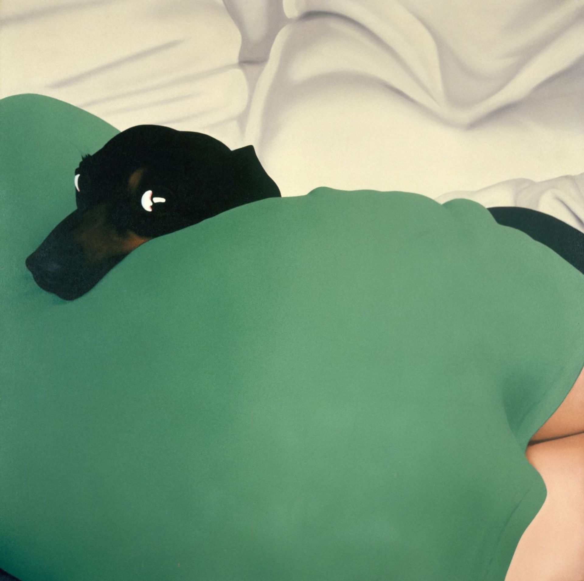 « 69 année érotique » s’ouvre par un grand format de Jacques Monory, Dream Tiger N°5, qui n’avait plus été exposé depuis vingt ans, une allégorie saisissante d’un désir masculin destructeur, face à L’égocentrique d’Evelyne Axell, délicieux assemblage de plexiglas coloré, une affirmation de l’autoérotisme féminin. Parmi la quarantaine d’œuvres exposées, l’une des plus déroutantes est sans doute Charlus de Gérard Schlosser, une grande machine qui frôle l’abstraction où les yeux blancs du teckel lové entre les hanches de sa maîtresse tancent le spectateur sur son voyeurisme éhonté.