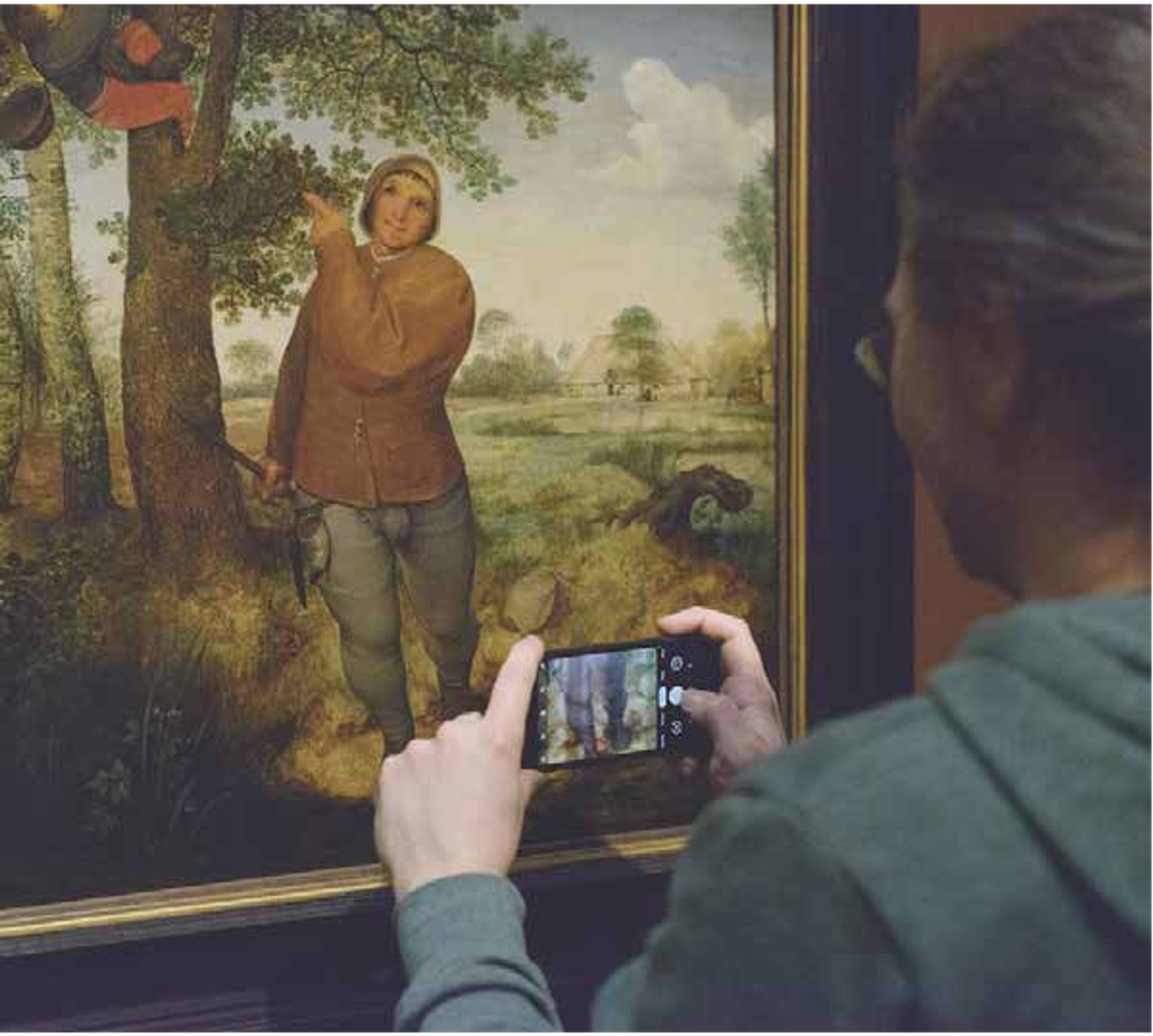 Pieter Brueghel l’Ancien, Le paysan et le voleur de nids (1568) avec guide multimédia à commande gestuelle au Kunsthistorisches Museum de Vienne. © Sabine Gruber / Arches