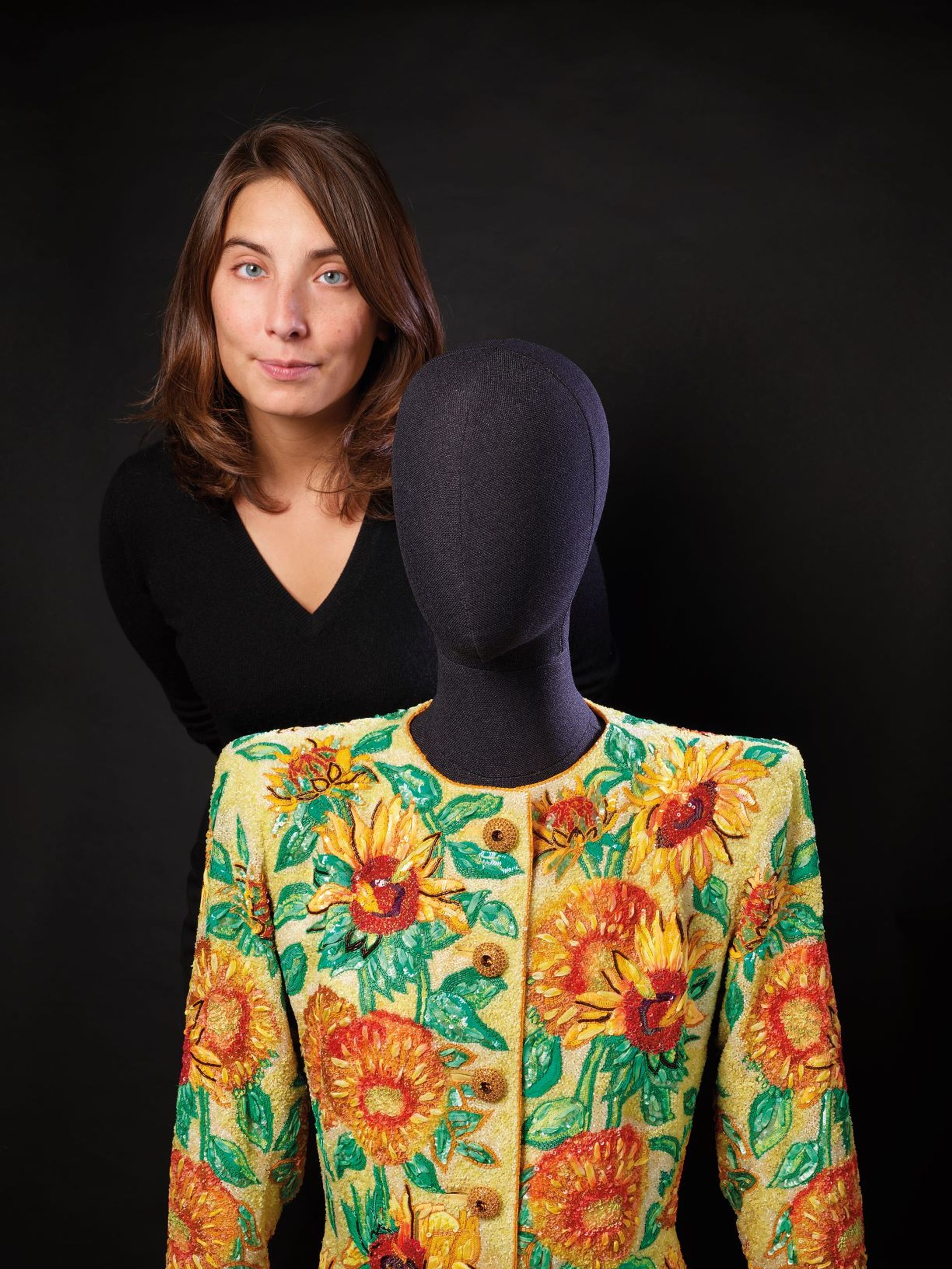 Camille de Foresta et la veste Tournesols, créée par Yves Saint Laurent en 1988. © Christie's