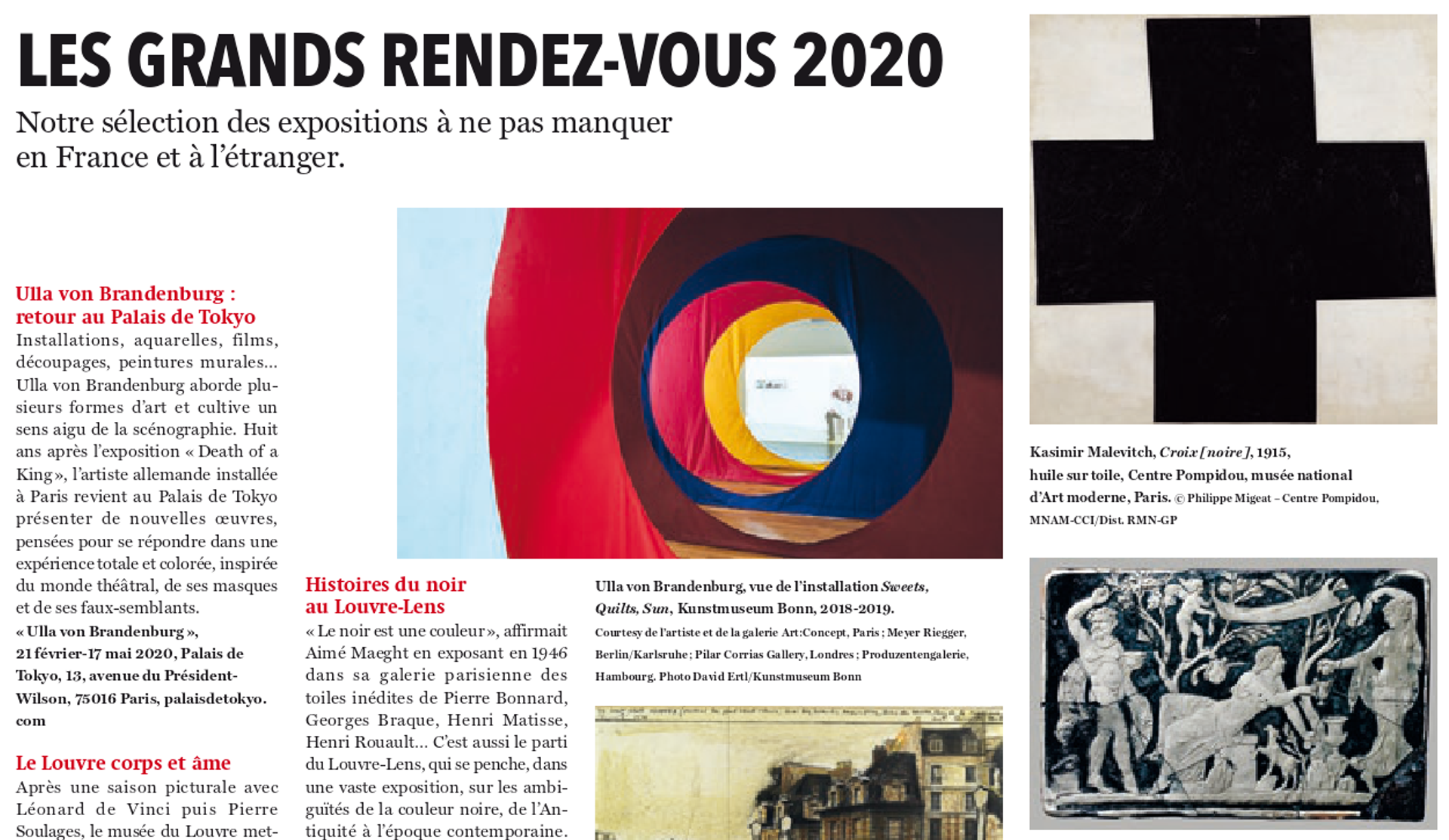 2020 s’annonce, elle aussi, tout aussi alléchante pour les amateurs d’art dans notre pays, dans un champ s’étendant de l’Antiquité à l’art contemporain. Ainsi, le Grand Palais accueillera « Pompéi » (25 mars-8 juin), le musée du Louvre consacrera une grande exposition inédite au peintre germanique de la Renaissance Albrecht Altdorfer (23 avril-3 août), tandis que le Petit Palais offrira ses cimaises à la collection Prat (24 mars-12 juillet). Alors que le Festival Normandie Impressionniste proposera sa 4e édition cet été (4 avril-6 septembre) sur le thème « La couleur au jour le jour », le musée d’Orsay mettra à l’honneur James Tissot (24 mars-19 juillet). Dans le domaine de l’art moderne, le Centre Pompidou offrira une nouvelle exposition Matisse (13 mai-31 août), tandis que Victor Brauner sera présenté au musée d’art moderne de Paris (24 avril-16 août), Chirico au musée de l’Orangerie (1er avril-13 juillet) et que le musée d’art et d’histoire du judaïsme proposera « Chagall, Modigliani, Soutine… Paris pour école (1905-1940) » (2 avril-23 août). La Fondation Louis-Vuitton se penchera quant à elle à partir d’octobre sur la Collection Morozov après avoir exposé celle de Sergueï Chtchoukine en 2016-2017. Auparavant, le musée du bois de Boulogne aura accueilli Cindy Sherman (1er avril-31 août). Toujours du côté de l’art contemporain, Laure Prouvost prolongera son pavillon français de la Biennale de Venise 2019 aux Abattoirs de Toulouse (24 janvier-31 mai), Damien Hirst dévoilera ses nouvelles peintures à la Fondation Cartier (à partir du 15 juin) et William Kentridge interviendra au LaM à Villeneuve d’Ascq (5 février-5 juillet). Enfin, Christo et Jeanne-Claude seront accueillis au Centre Pompidou (18 mars-15 juin), avant d’empaqueter du 19 septembre au 4 octobre l’Arc du Triomphe. Une année triomphale donc, surtout si l’on y ajoute les ouvertures de la Pinault Collection à la Bourse de Commerce, de la Fab d’Agnès b., de l’hôtel de la Marine et la réouverture du musée Carnavalet !