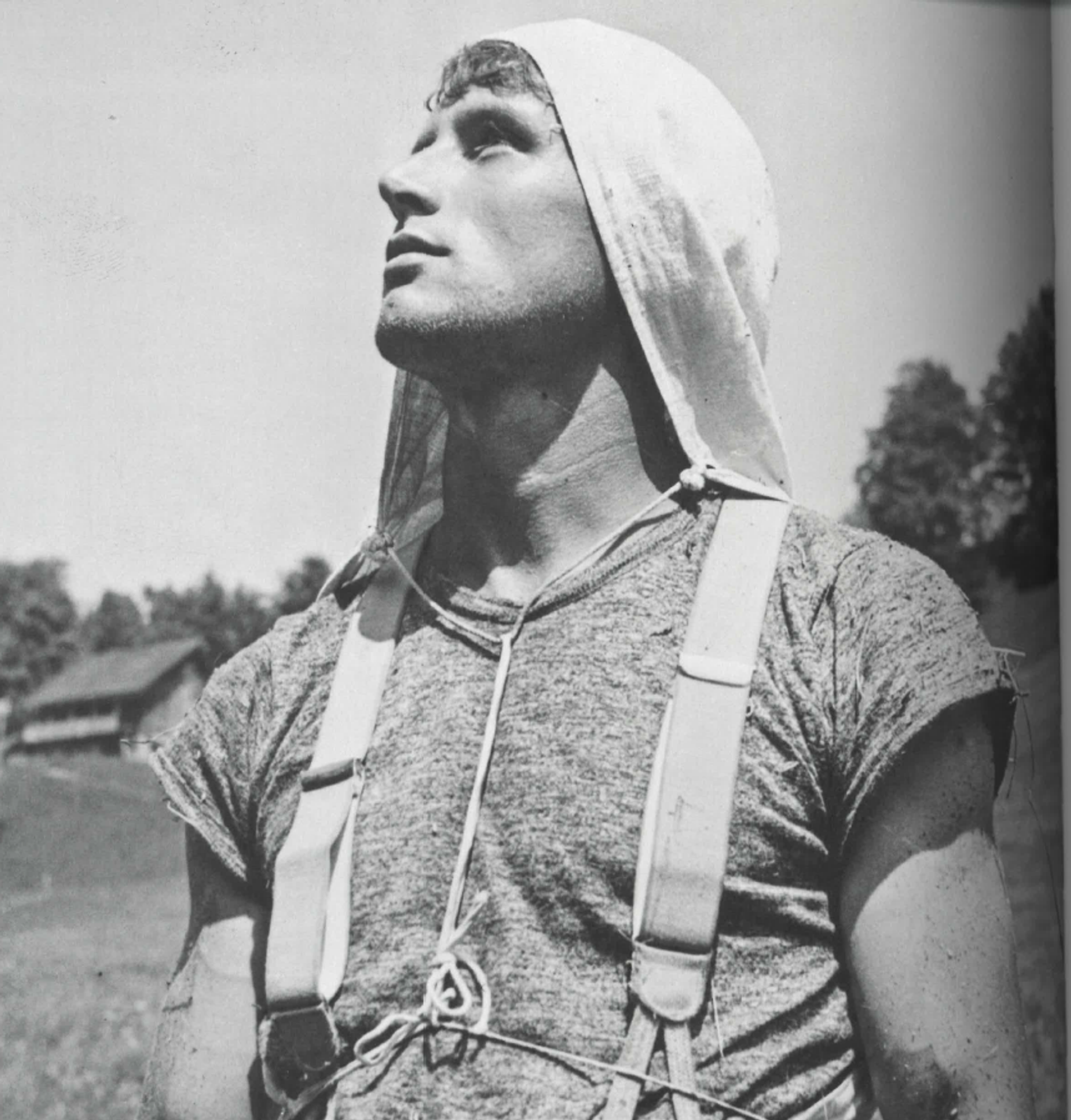 Fredy Pletscher, Portrait d’un paysan lors des foins, un linge blanc sur la tête, tirage gélatino-argentique, vers 1940. Courtesy Musée National Suisse, Zurich. © Collection Ruth et Peter Herzog.