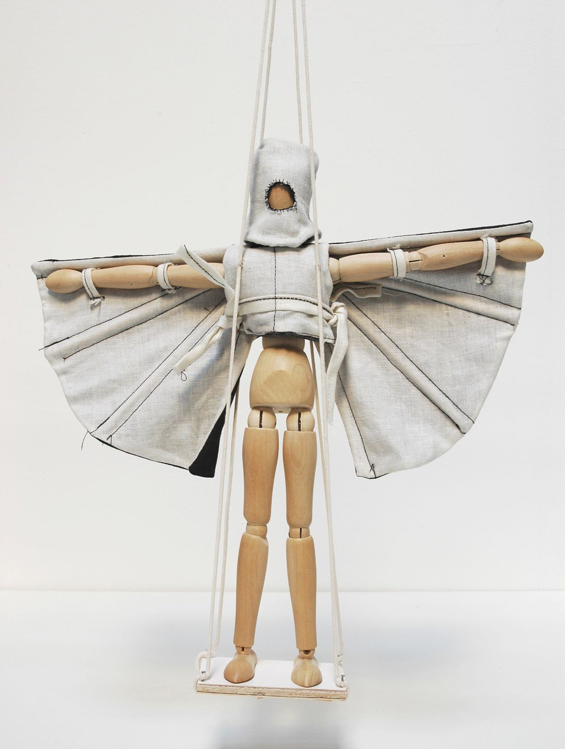 Kristina Depaulis, Expérience de vol 1, maquette, 2007, tissus, bois, fil, carton, mannequin en bois, 30 x 30 cm. Photo : Antoine Gatet. © Collection FRAC Limousin