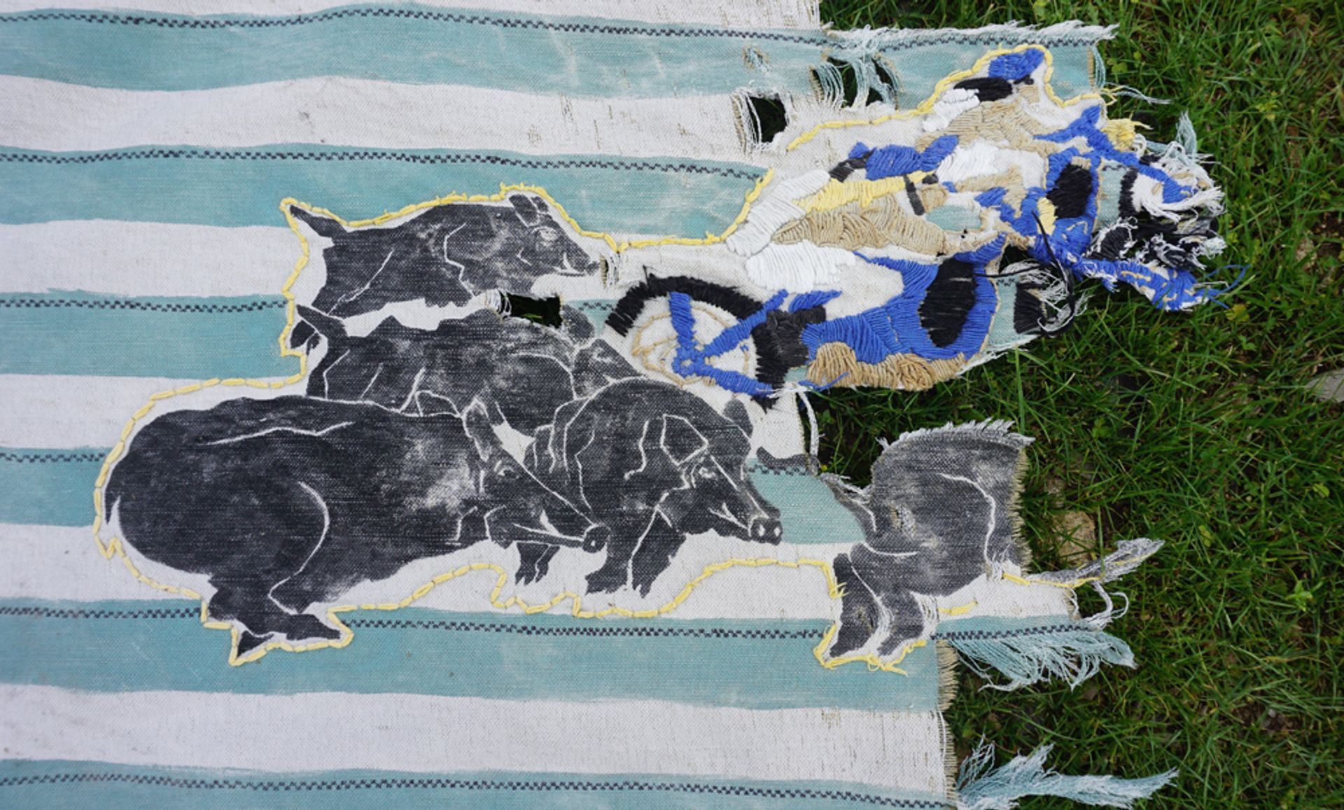 Aurélie Ferruel et Florentine Guédon, La fête du rrrhoh rrrhoh (détail), 2018, pierre calcaire d’Euville, bois d’acacia et tissu. © Aurélie Ferruel et Florentine Guédon