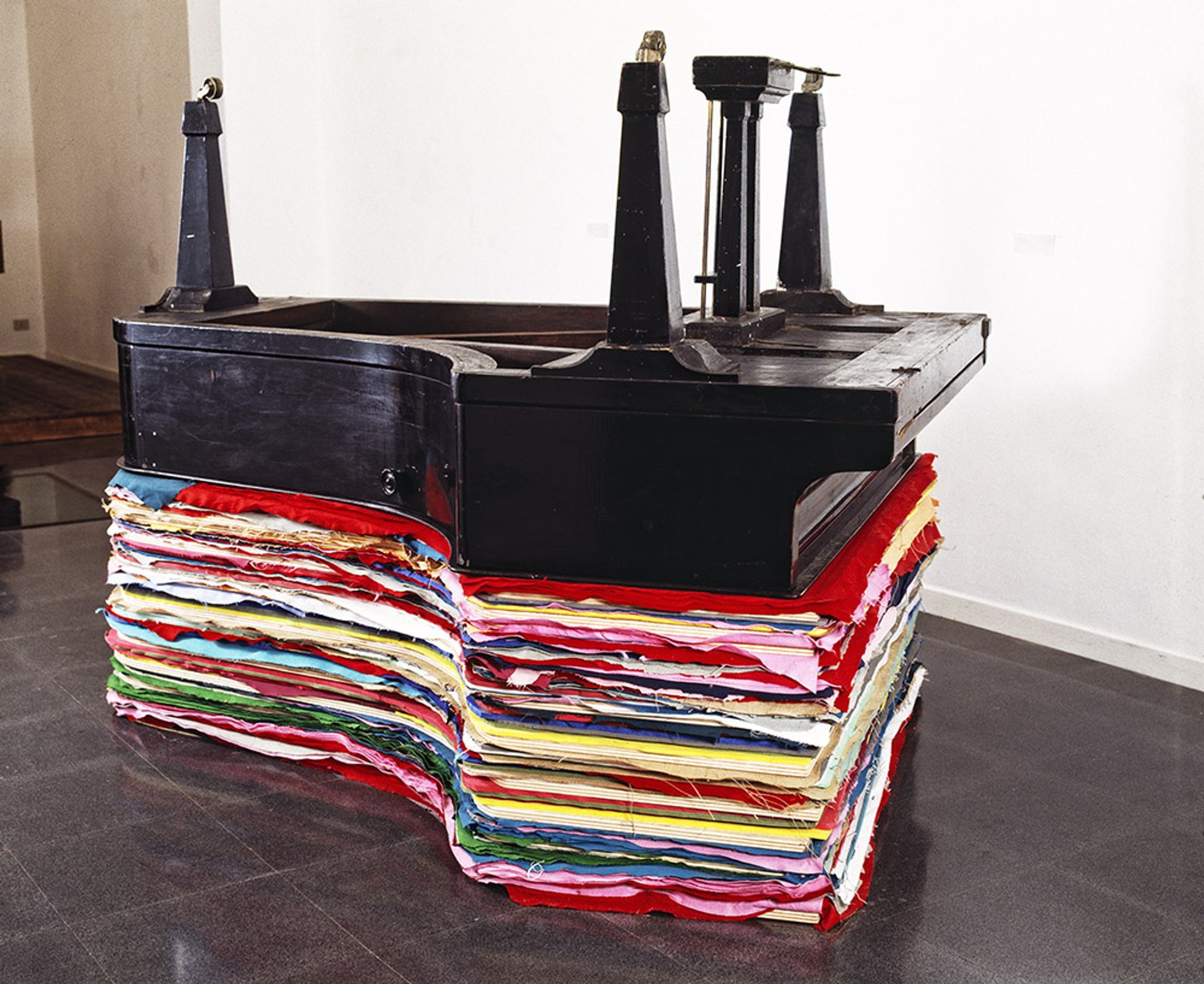 John Cage, Please play or the mother the father or the family, 1990, piano à queue, papier, tissu, bois. Photo : Archive Fabrizio Garghetti. © Collection Gino di Maggio (Milan) & The John Cage Trust