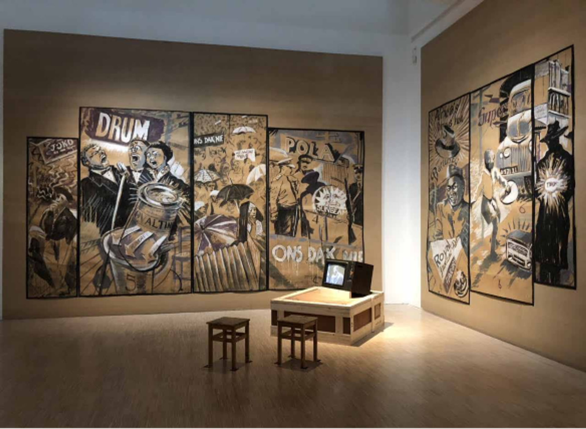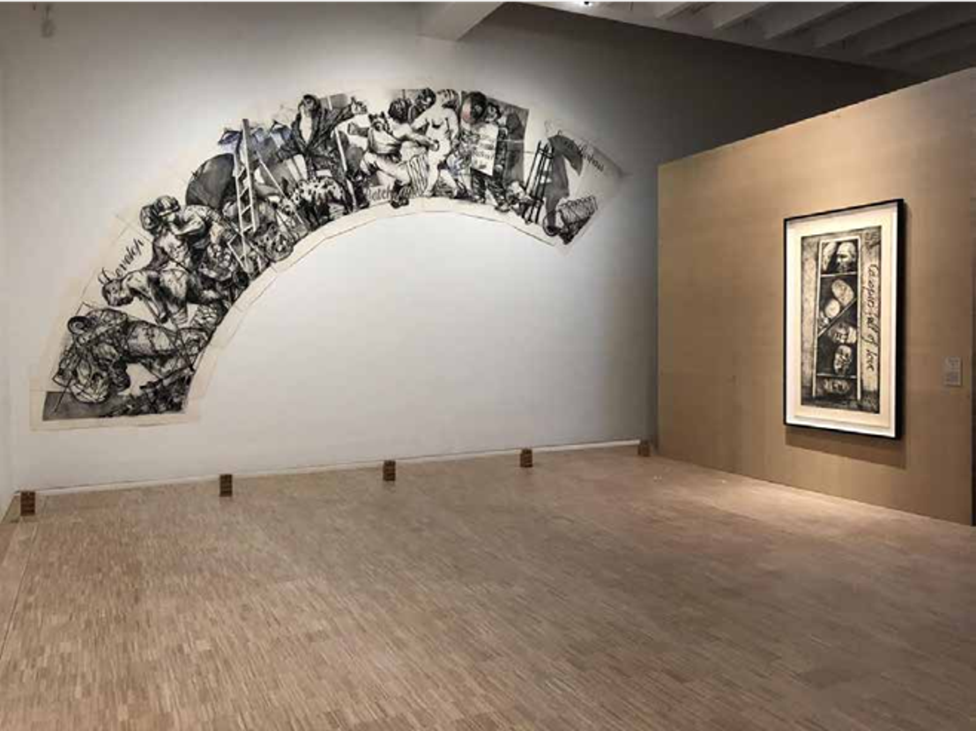 Dès l’entrée, le visiteur est plongé dans l’univers de Kentridge, celui de Sophiatown, son premier spectacle (1989) qui dénonce, en les mettant en scène, l’évacuation forcée et la démolition de ce quartier noir de Johannesburg, témoignant d’emblée de sa démarche de défi face à l’apartheid en Afrique du Sud, son pays natal. Un ensemble d’une vingtaine d’immenses gouaches sur papier kraft – exposé pour la première fois dans son intégralité en Europe – monte du sol au plafond, un rappel que Kentridge reste d’abord un dessinateur hors pair, principalement dans la maîtrise du noir et blanc. On s’en convaincra à nouveau un peu plus loin, avec sa vaste fresque murale réalisée à main levée, la veille du vernissage.