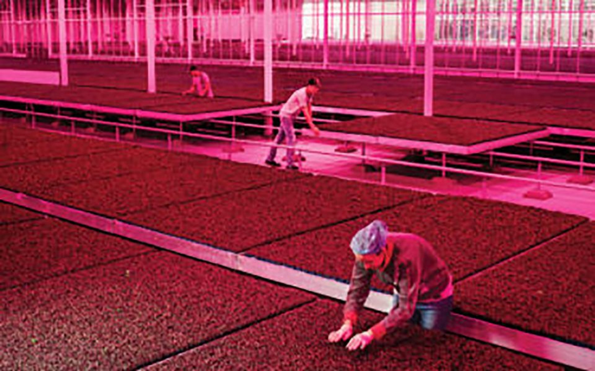 Une serre aux Pays-Bas, dans laquelle des fermiers travaillent de nuit sous une lumière rose destinée à assurer des conditions de croissance optimales. Pieternel van Velden