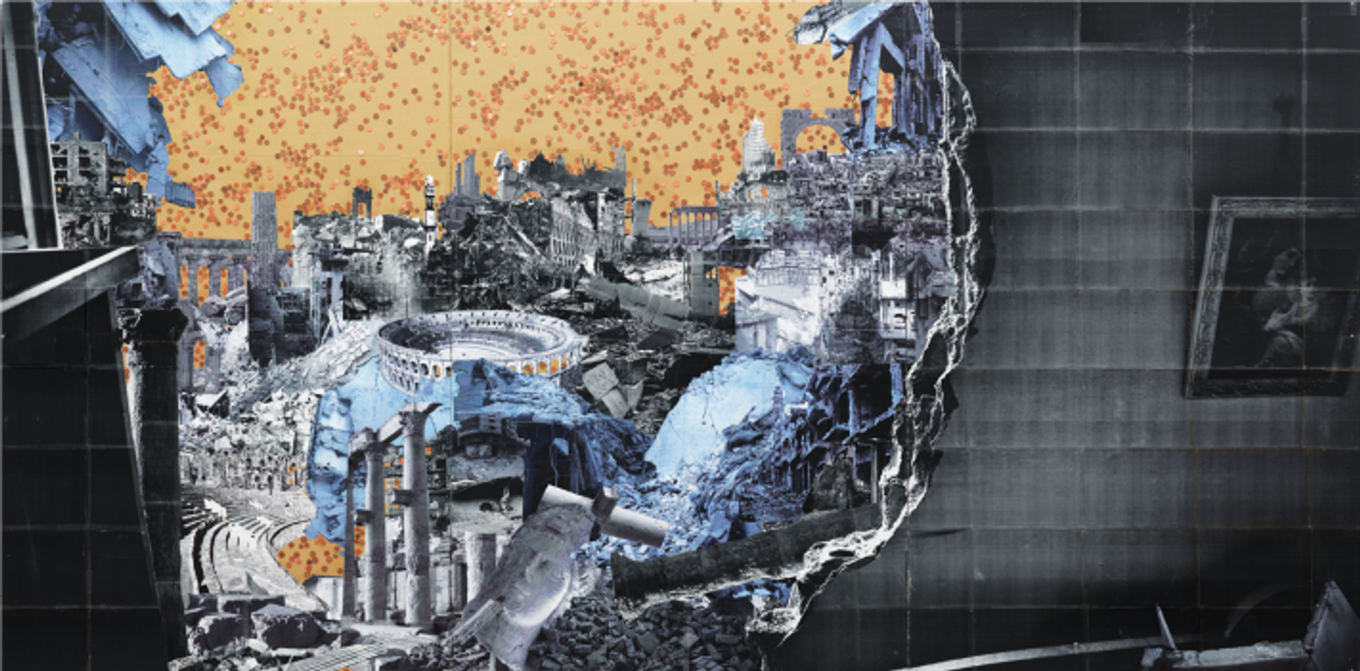 Thomas Hirschhorn, Ruins Ahead, (triptyque), 2016, carton, papier imprimé, ruban adhésif, pièces de monnaie. © 2018, ProLitteris, Zurich. Collection Pictet