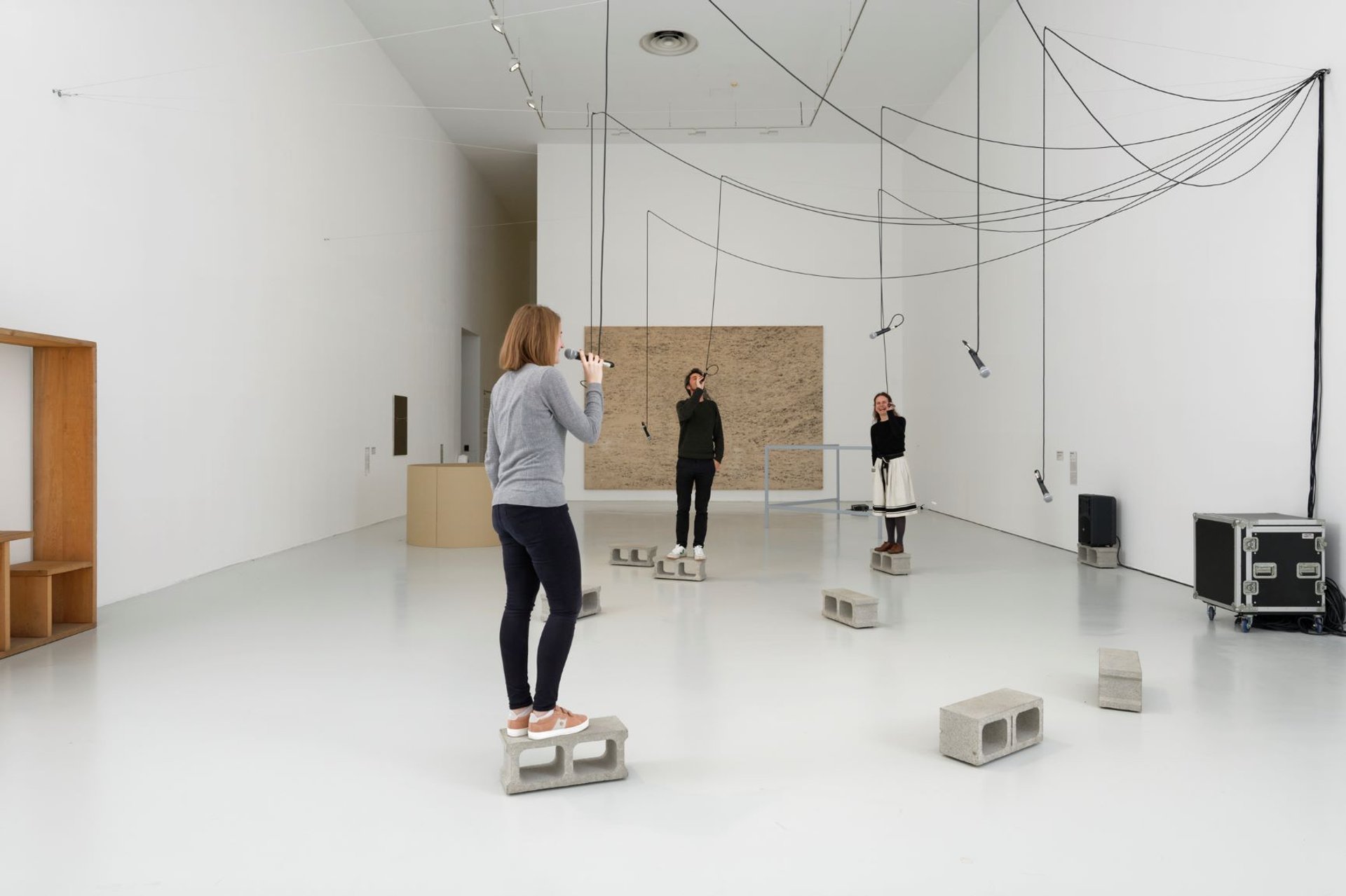 Vue de l’exposition « Entrare nell’opera - Entrer dans l’œuvre » au Musée d’art moderne et contemporain de Saint-Étienne Métropole. Gilberto Zorio, Microfoni, 1969, microphones, mélangeur audio, câbles, amplificateur, processeur d’effets d’écho, brique en béton, collection Gilberto Zorio © ADAGP, Paris 2019. Photo : Aurélien Mole / MAMC+