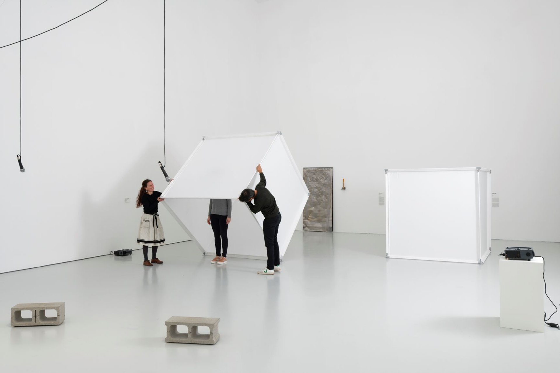 Vue de l’exposition « Entrare nell’opera - Entrer dans l’œuvre » au Musée d’art moderne et contemporain de Saint-Étienne Métropole. Luciano Fabro, In cubo, 1966, bois, toile, collection privée. © Droits réservés. Photo : Aurélien Mole / MAMC+