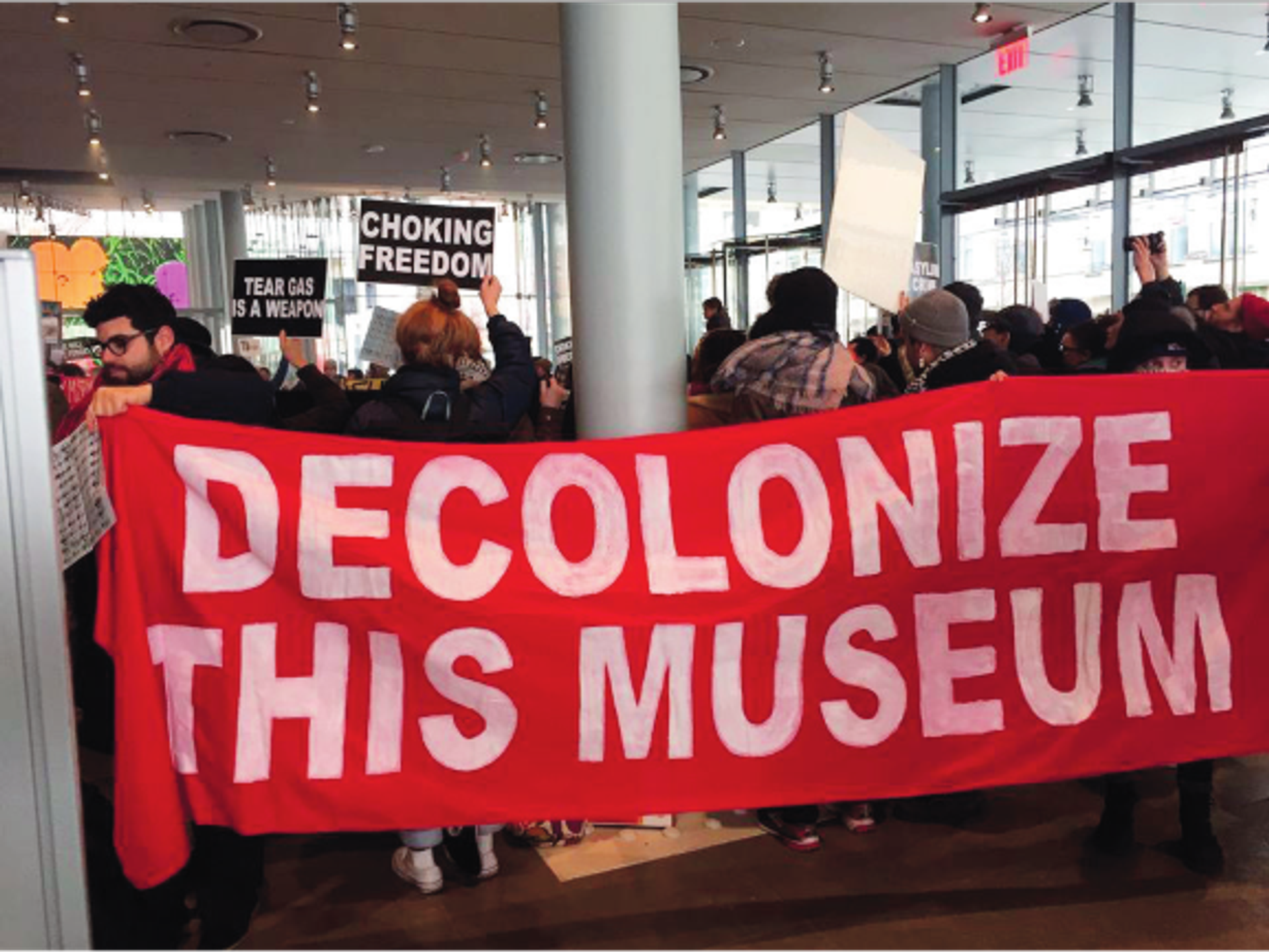En décembre 2018, des manifestants au Whitney Museum of American Art, à New York, exigent le départ de Warren Kanders, son vice-président. Sa société Safariland fabrique les cartouches de gaz lacrymogène dispersé sur les demandeurs d’asile à la frontière américano-mexicaine. © The Art Newspaper