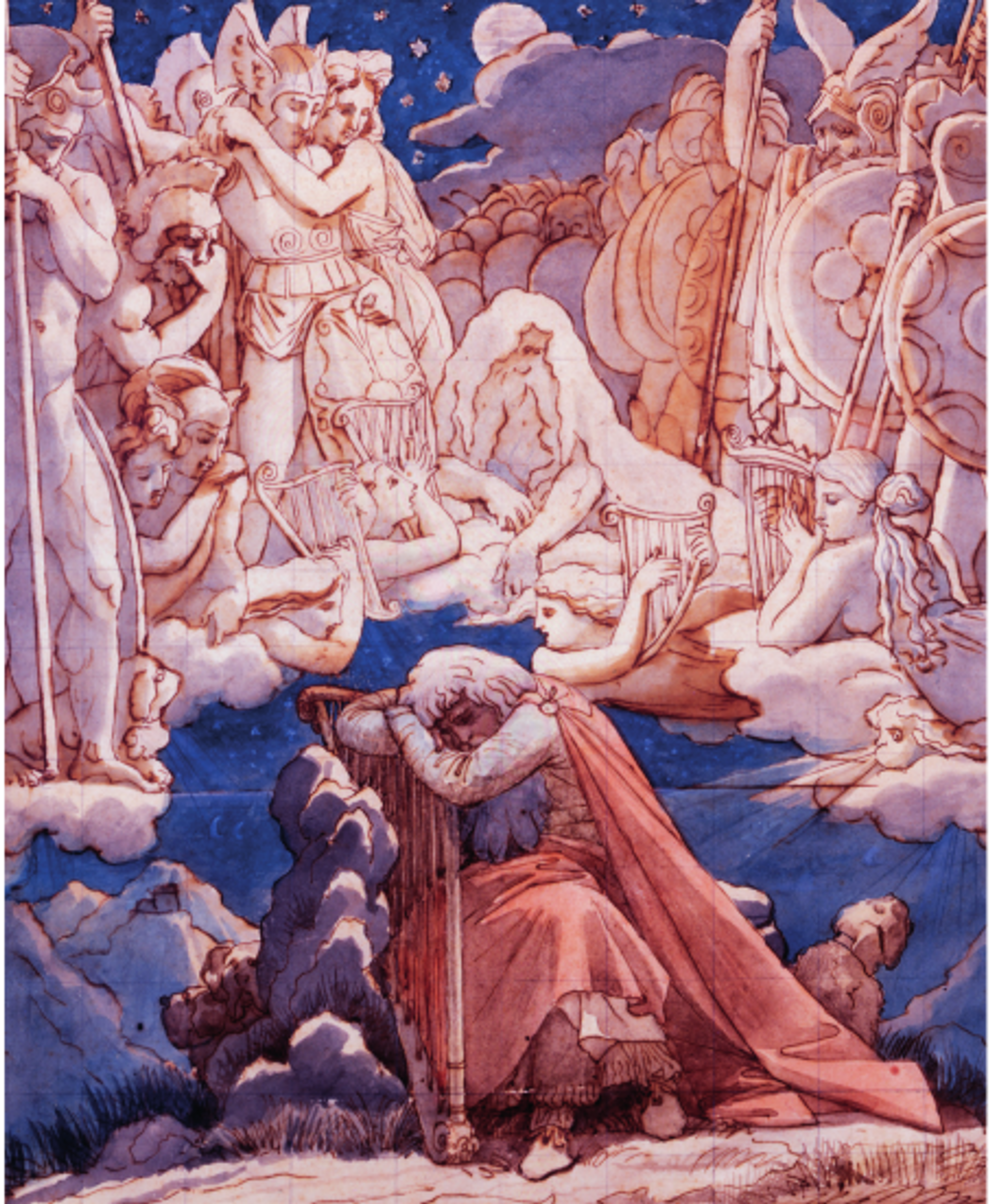 Jean-Dominique Ingres, Songe d’Ossian, xixe siècle, plume et encre brune, aquarelle, mise au carreau à la pierre noire, collection Prat. © D.R