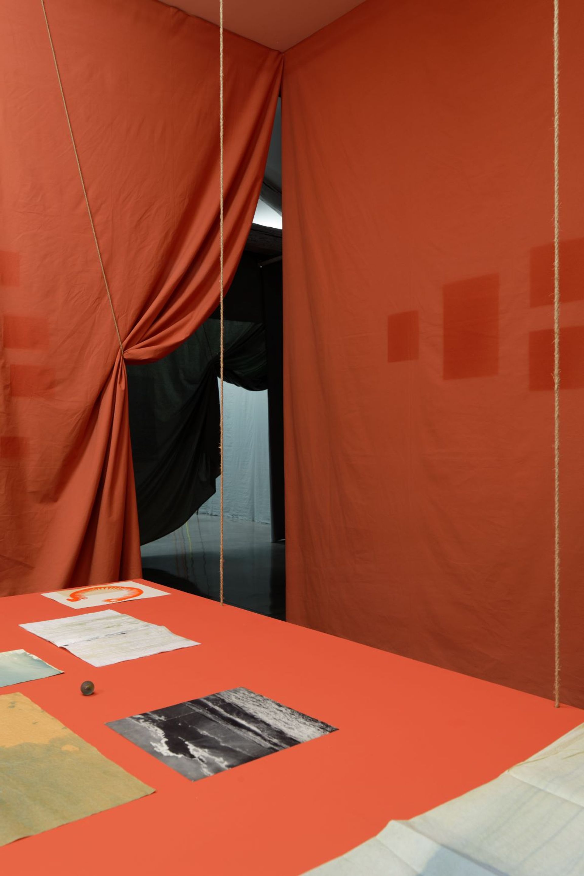 Ulla von Brandenburg, L’Hier de demain, 2019, tissus teints et peints, œuvres sur papier et divers objets, tables en bois suspendues. Courtesy de l’artiste et Art:Concept, Paris/ Meyer Riegger, Berlin, Karlsruhe/ Pilar Corrias Gallery, Londres/ Produzentengalerie, Hambourg. Photo Mrac, Sérignan/Aurélien Mole