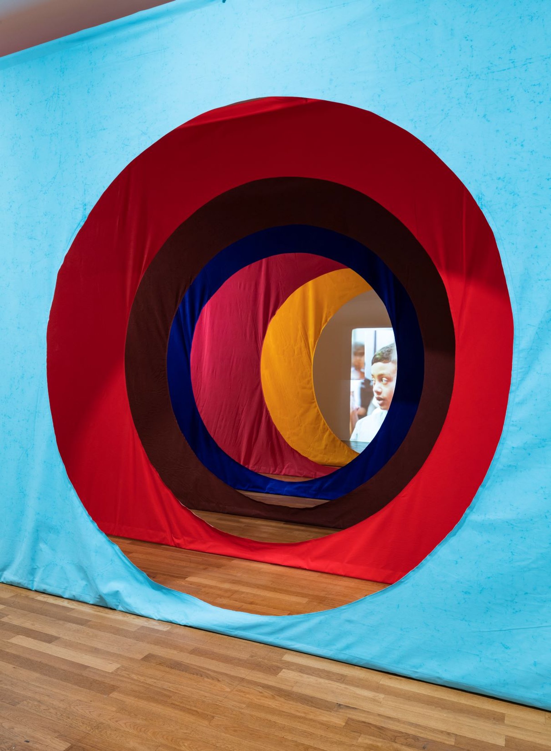 Le prologue de l’exposition, qui est également son épilogue, est un monumental déploiement de panneaux en tissu peints, suspendus parallèlement dans le hall. Chacun présente un trou en forme de disque. L’alignement de ces vides dessine comme la lentille d’un appareil photo. Il fait aussi penser à la forme du théâtre de Bussang, à travers lequel on peut regarder. Une façon d’inviter le visiteur à fabriquer ses propres images ?