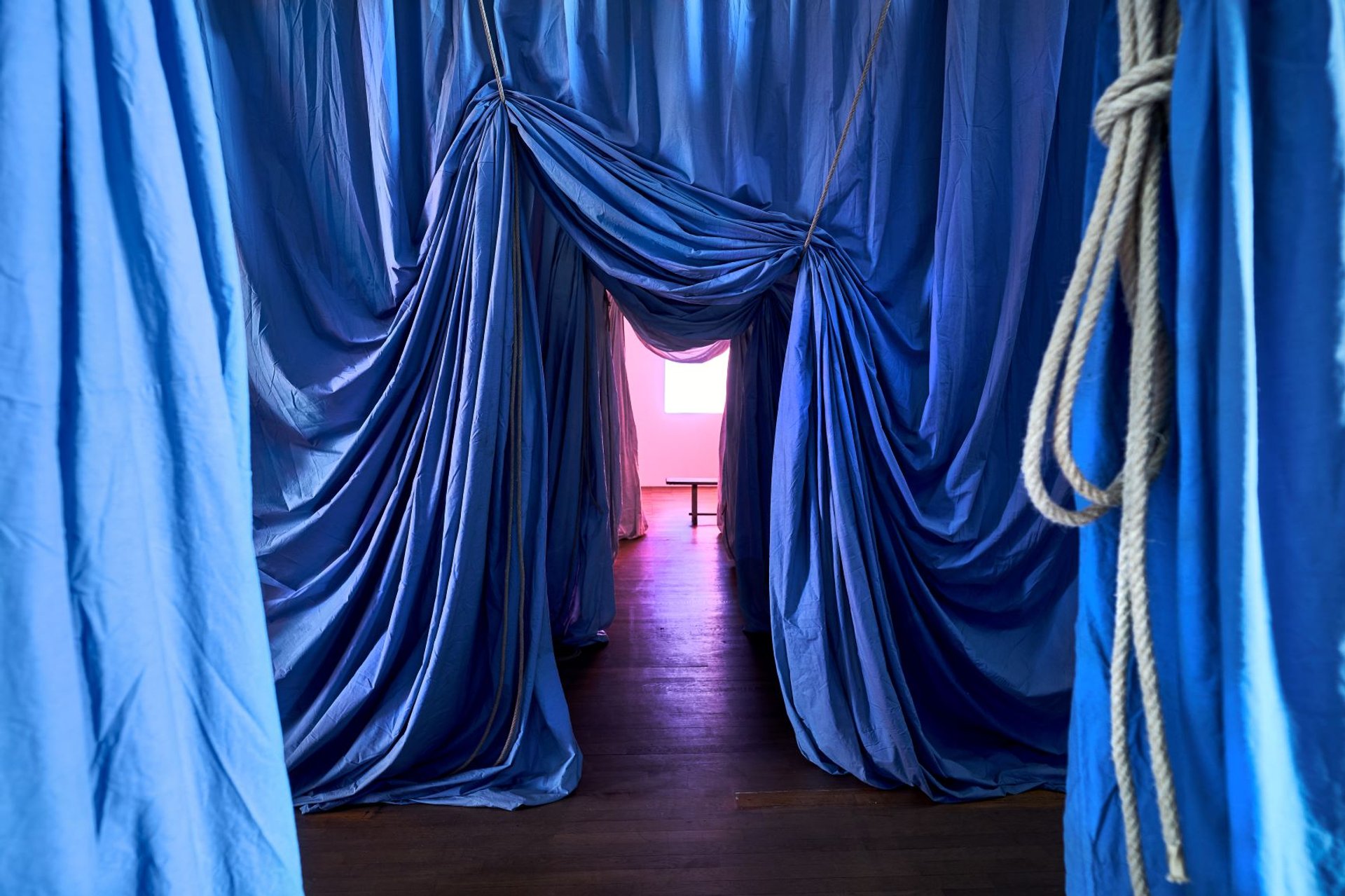 Ulla von Brandenburg, C, Ü, I, T, H, E, A, K, O, G, N, B, D, F, R, M, P, L, II, 2019, tissus teints, cordes, film super-16, couleur, son. Courtesy de l’artiste et Art:Concept, Paris/Meyer Riegger, Berlin, Karlsruhe/Pilar Corrias Gallery, Londres/ Produzentengalerie, Hambourg. Photo Kunstmuseum Bonn/David Ertl