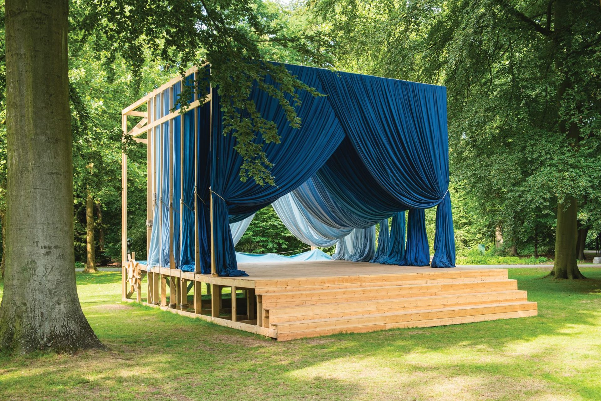 Ulla von Brandenburg, Le soleil te regarde, 2018, structure en bois, tissus teints, corde. Courtesy de l’artiste et Art:Concept, Paris/ Meyer Riegger, Berlin, Karlsruhe/ Pilar Corrias Gallery, Londres/ Produzentengalerie, Hambourg. Middelheimmuseum, Anvers, performance de Benoît Résillot, photo Tom Cornille