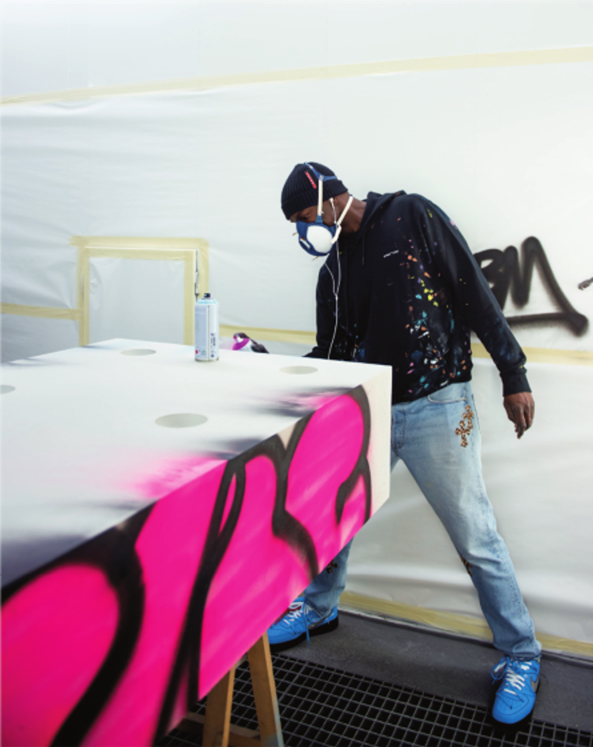 Virgil Abloh réalisant un tag pour son exposition « Efflorescence ». © Marie Canciani, courtesy galerie kreo