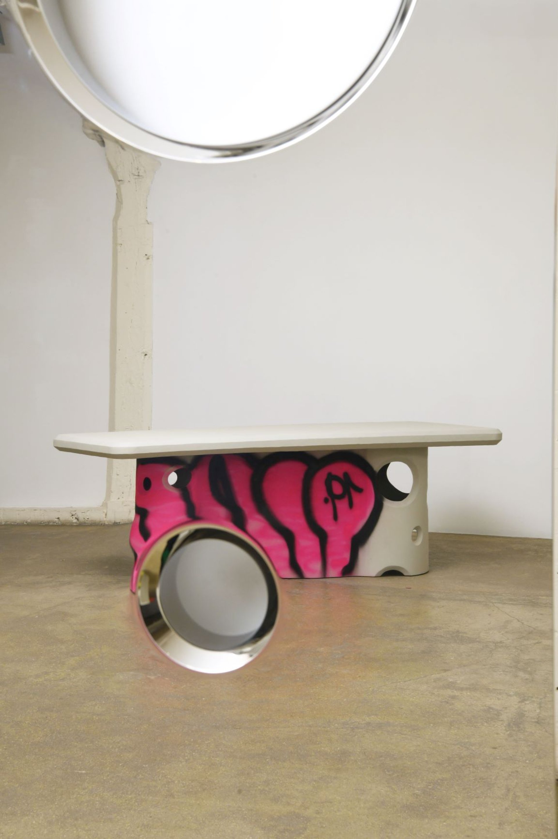 Ils sont faits dans un béton d’une qualité écologique qui n’existait pas il y a cinq ou six ans : une table basse, un banc évoquant une piste de skate, deux grands pots de jardin, une table de conférence, des chaises, un bureau, deux miroirs ressemblant à un smartphone dans lequel on ferait des selfies... Tous sont couverts de tags colorés, dont Didier Krzentowski parle comme d’une couleur appliquée sur la matière. « Si on les avait posés dans la rue, ils seraient revenus comme je les ai faits », dit Virgil Abloh, qui a passé quelques jours à travailler chez un carrossier pour réaliser ces pièces. On dirait du béton très lourd, mais c’est une matière plus légère qu’il n’y paraît, d’autant plus que des perforations traversent ces objets. « Ce qui les rend confortables, c’est qu’ils sont légers », explique-t-il encore. Chaque meuble de la série est crénelé sur l’un de ses côtés pour donner l’idée qu’ils pourraient s’encastrer les uns dans les autres et former un tout. L’idée d’une totalité revient en permanence dans son discours, comme un idéal. « Je veux créer des œuvres qui parlent à ceux à qui on ne parle pas, qui distillent à travers des objets de grands sujets comme l’environnement, la guerre, la politique... » Il nous a raconté son projet.