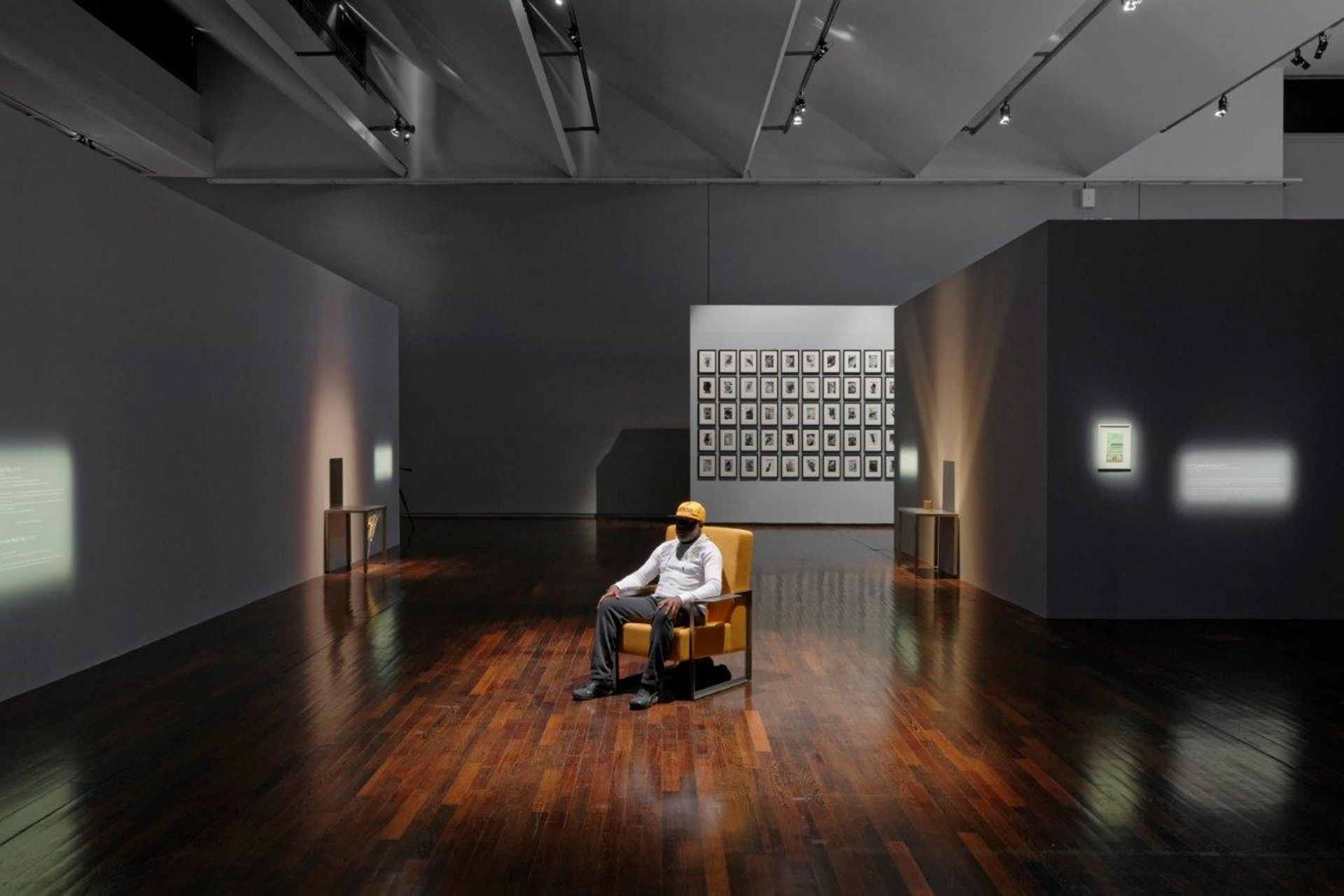 Brognon Rollin, vue de l’exposition « L’avant-dernière version de la réalité », MAC VAL 2020. Au centre, Until Then (MAC VAL), 2020, performance, durée variable. Line sitter Elvin Williams (Same Old Line Dudes), en collaboration avec Yves De Locht, médecin généraliste (Bruxelles). Production MAC VAL. Photo : Aurélien Mole