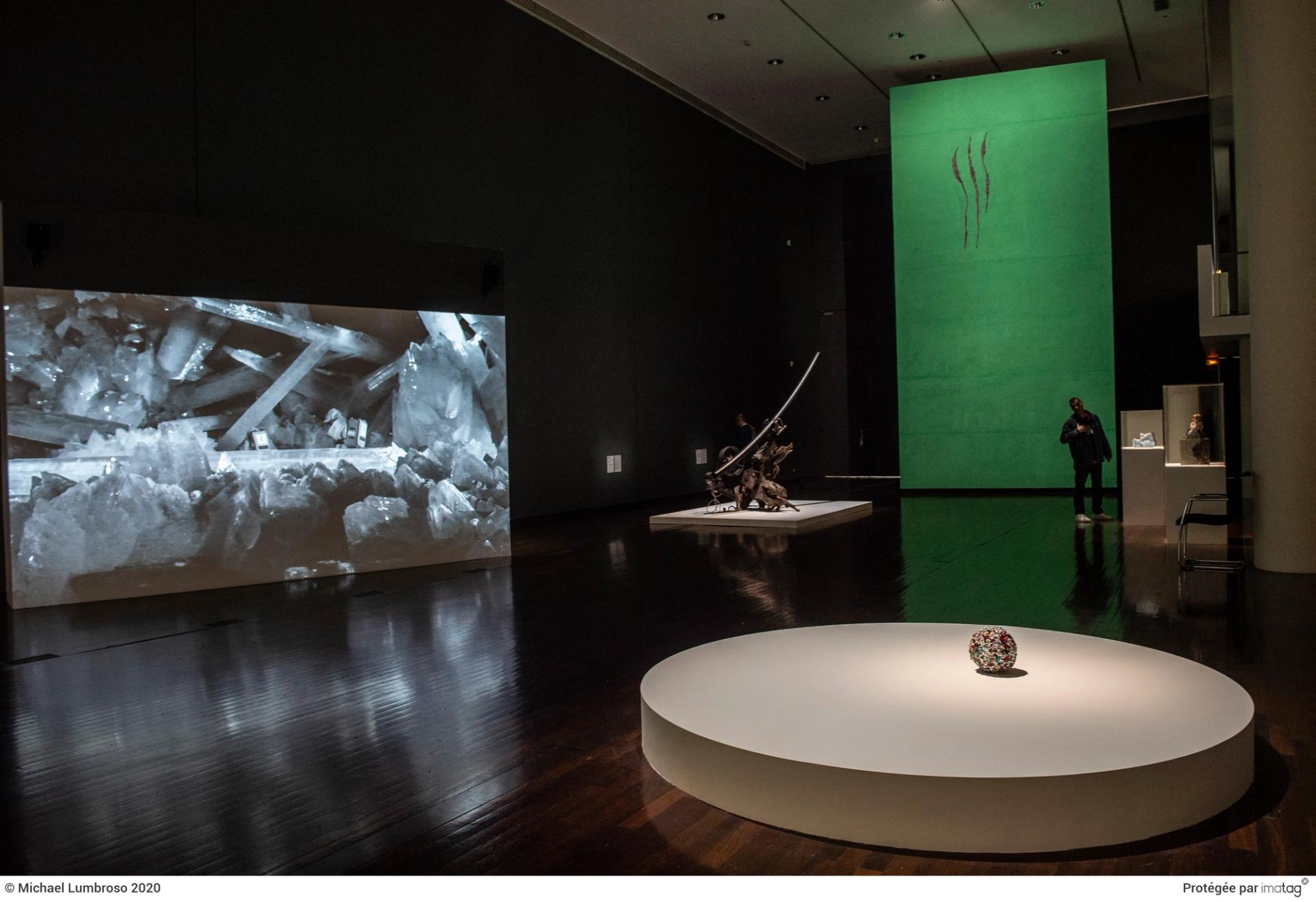 Vue de l’exposition de la collection « Le vent se lève », MAC VAL 2020. Au premier plan, Véronique Boudier, It has trouble turning, 2002, pierres synthétiques, H. 21 cm ; diam. 70 cm. Collection MAC VAL. À gauche, Angelika Markul, Si les heures m’étaient comptées, 2016, installation vidéo, noir et blanc, son, 11’47’’. Collection MAC VAL. Acquis avec la participation du FRAM Île- de-France. © Adagp, Paris 2020. Au fond, Virginie Yassef, Il y a 140 millions d’années, un animal glisse sur une plage fangeuse du Massif central, 2009, bois, polystyrène résiné, crépi, peinture acrylique, 800 x 400 x 24 cm. Collection MAC VAL. © Adagp, Paris 2020. Photo : Michael Lumbroso