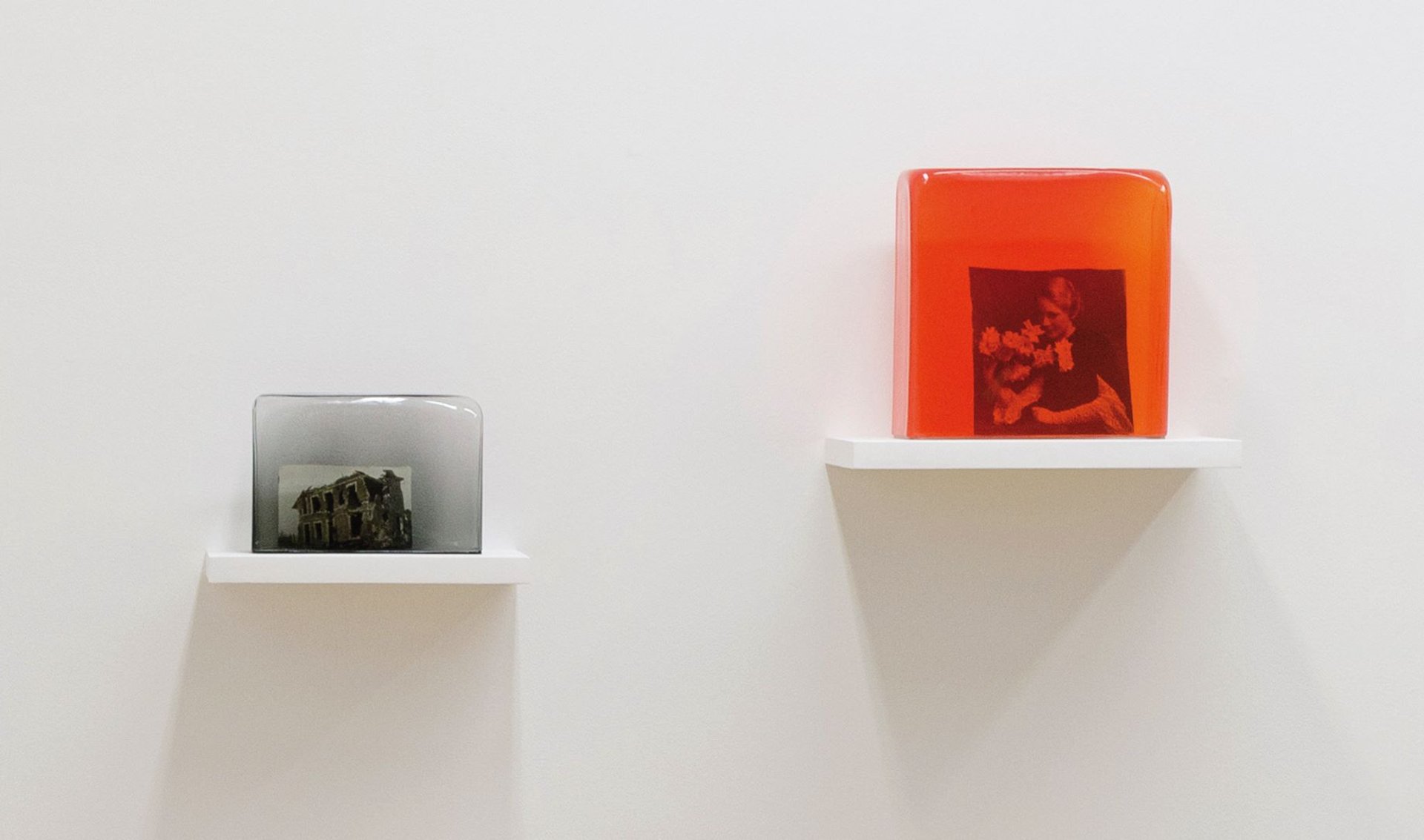 Agnès Geoffray, Les Captives (ruine + femme fleur), 2020, photographies anonymes, verre soufflé, 15 x 22 x 8 cm + 28 x 28 x 12 cm, Collection FRAC Auvergne, achat à la galerie Maubert, Paris. D.R., Courtesy du FRAC Auvergne